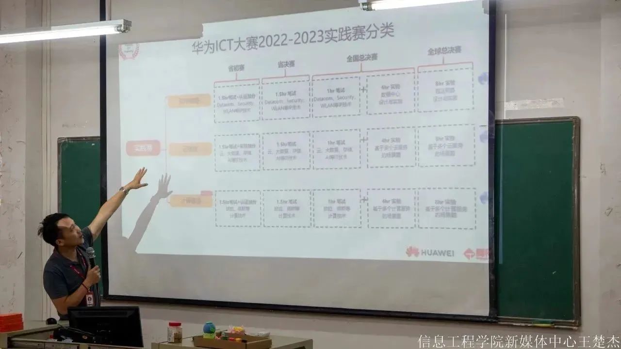 为了持续加强对大学生的技术支持和培养力度,加速ICT人才的培养,信息工程学院于10月13日14点10分在博学楼b401开展华为ITC大赛讲座。本次讲座由学生干部陈宇聪主持。