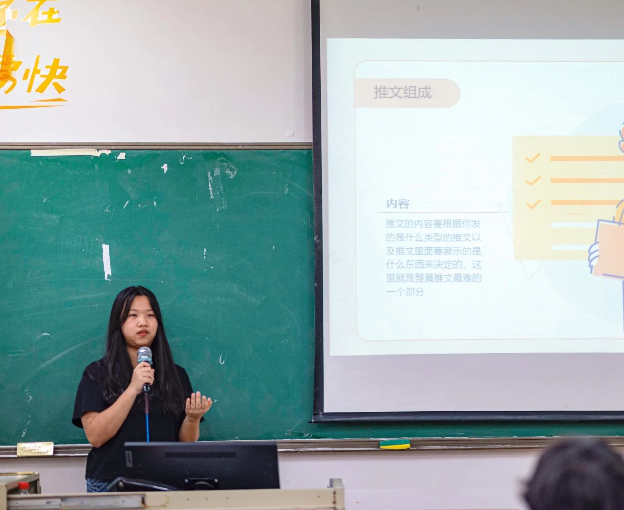 首先, 她带领大家了解推文组成,她表示,了解推文能够让大家更好地去定下自己的推文基调,她将推文大致拆分成标题、内容、结尾三部分,分别将其中的要点列出来,跟大家一一讲解。在讲到推文主体内容时,她向大家强调,写好一篇推文就跟如何写好一篇作文一样,要让读者感受到这是一篇完整的文章,而不要让读者感觉是东拼西凑的。她将推文中经常出现的大标题与小标题,还有一些图片文字的选择排版与同学们举例讲解,并说明在不同情况下,该如何去选择合适的结尾内容。