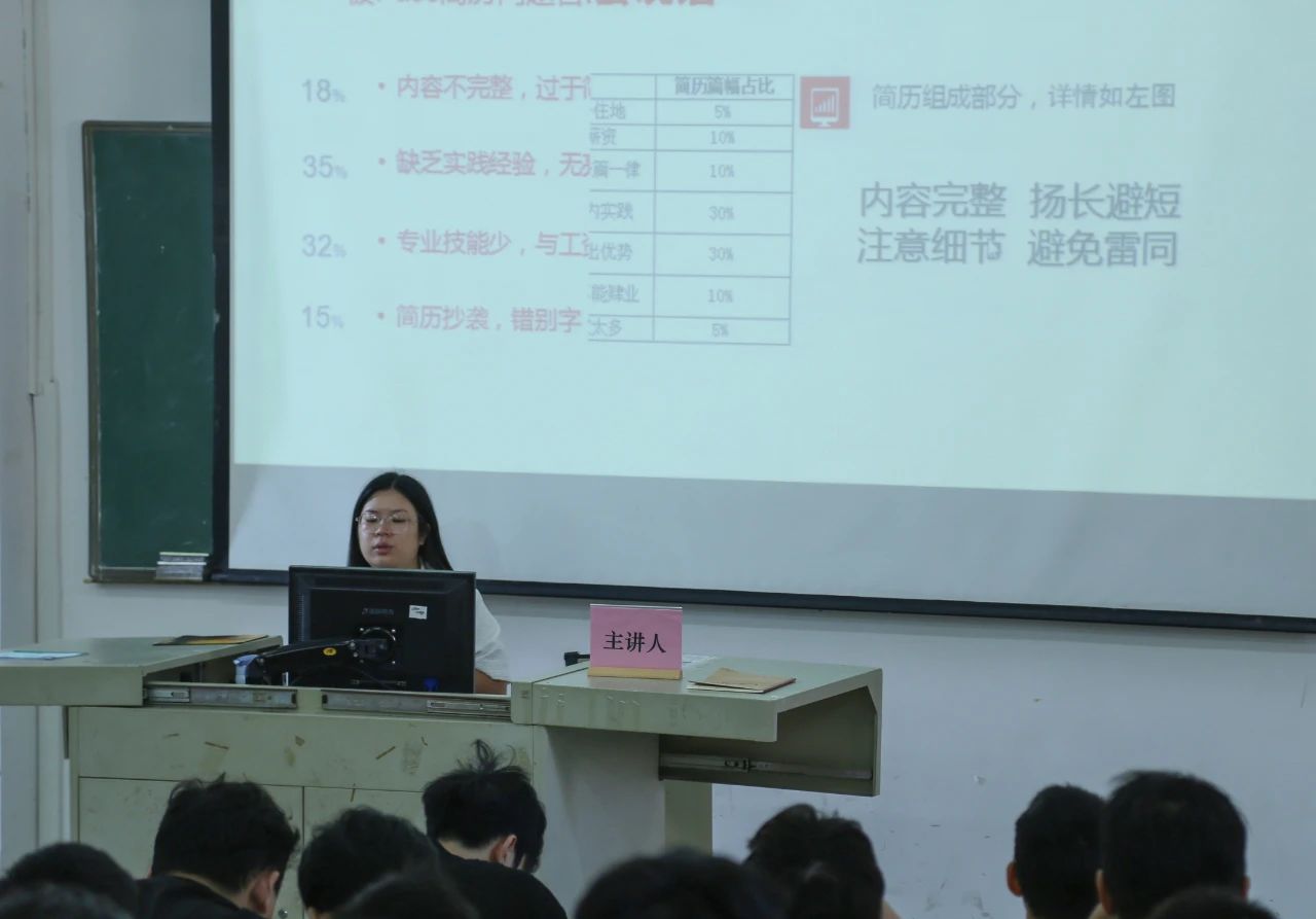紧接着,她又为大家讲解了从毕业到就业的大致流程,告诉大家要提前制定职业计划,例如,将先找到一份实习工作作为一个小目标,写好自己的简历,要“内容完整,扬长避短。”并提醒大家在将来面试的时候,千万不要将实习经历空着,并表示在面试前要熟悉好自己简历,面试后也要对自己的面试进行总结。