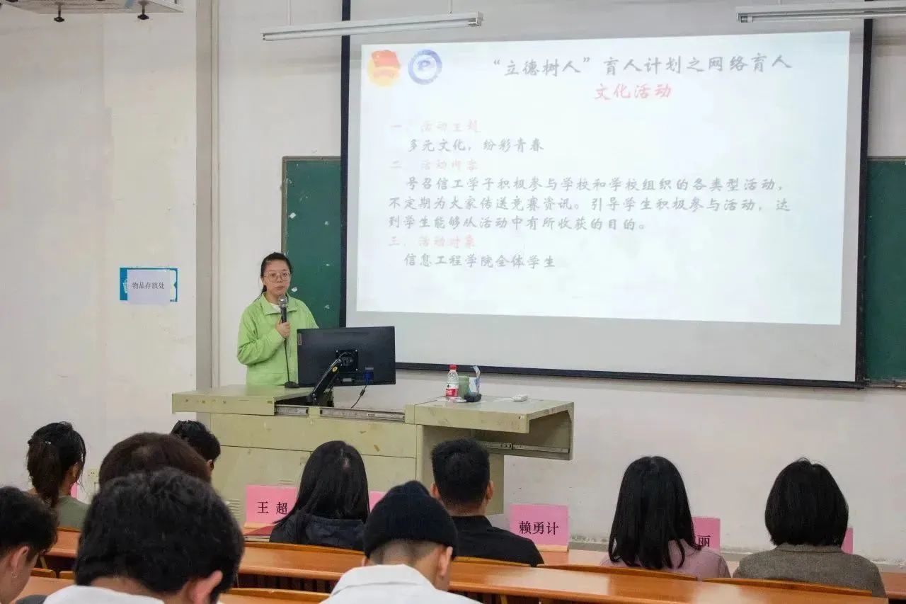 王超指出,立德就是坚持德育为先,通过正面教育引导人、感化人、激励人;树人就是以人为本,通过合适的教育通过合适的教育来塑造人、改变人、发展人。强调立德树人是信息工程学院的主课题,学校亦提供了许多舞台和方向来培养学生的品质和道德,比如新媒体正能量作品征集,希望同学们积极参与,丰富校园生活,且树立正确的人生态度。