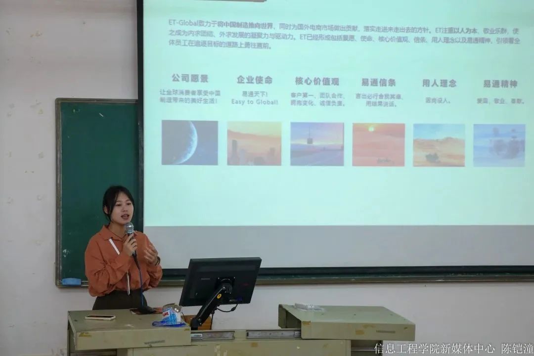 在姚学敏介绍完后,陈诗婷上台进行易通招聘宣讲。首先,她就“我们是谁?”这一问题,介绍了她们公司的创办历程以及一路走来获得的成就,并表示她们是Noon的第一位中国卖家,为大家展现了该公司的实力。