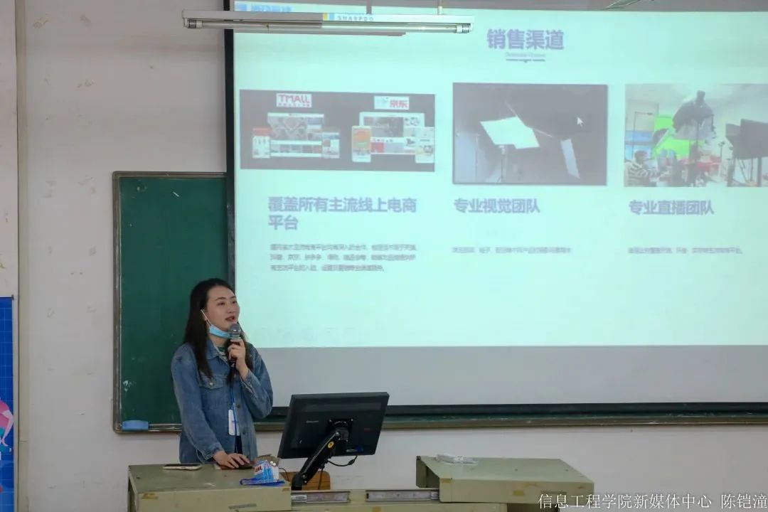 讲座开始,姚雪敏便为大家分享了她们公司创始人的创业故事,艰苦奋斗的过程让人不禁动容。随后,他为大家展示了公司的办公环境,介绍公司的产品与服务,并表示,她们的产品有专业的研发团队,销售渠道涵盖了所有主流线上电商平台,有专业的视觉团队、直播团队,业务能力强劲。