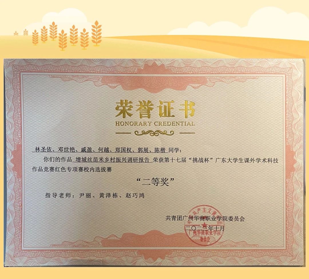 2022-2023学年:2022-2023学年荣获校二等奖学金、2023年6月国防教育活动荣获“优秀组织者”称号、2022-2023学年荣获“共青团标兵”称号、2022-2023学年荣获“优秀志愿”称号、2022-2023学年荣获“优秀辅导员助理”称号、2022-2023学年荣获“华职好青年”称号、2022-2023学年挑战杯比赛荣获二等奖。