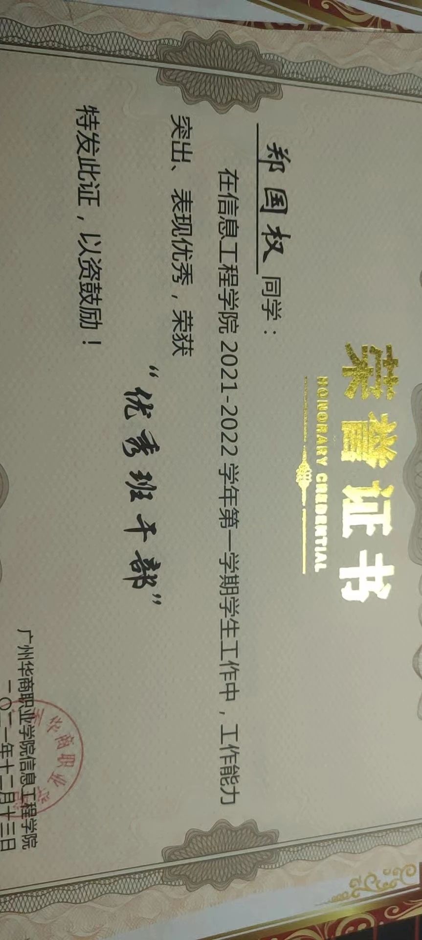 职务:现担任班级班长,曾任广州华商职业学院国防教育中心主席、信息工程学院青年志愿者协会理事、22级网络技术1班助班、院国防教育组成员、校射艺成员