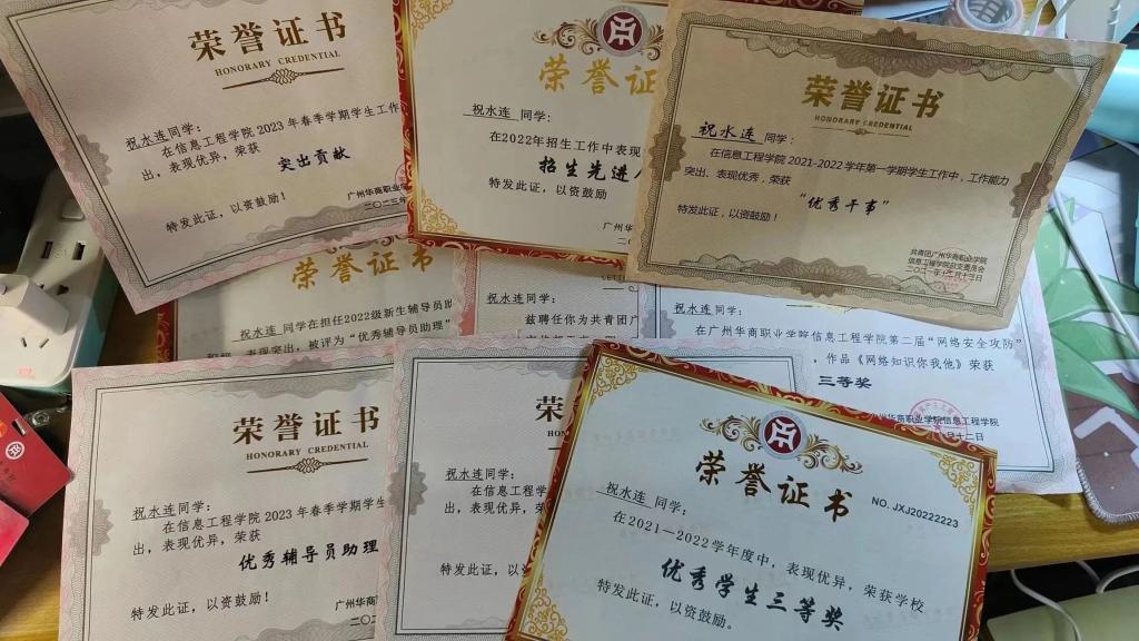 2023年获校奖学金二等奖、2023年获校级优秀辅导员助理、2023年获招生先进个人、2023年获信息工程学院优秀班干部、2023年获信息工程学院突出贡献奖、2023年获信息工程学院优秀辅导员助理、2023年获信息工程学院网络安全攻防海报设计第三名、2022年获校奖学金三等奖、2022年获招生先进个人、2022年获疫情先进个人、2021年获信息工程学院优秀干事。