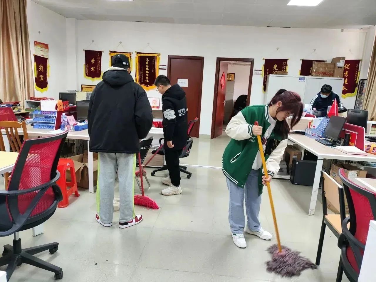经过大家的共同努力,办公室、会议室、阳台等地焕然一新,呈现出一片干净整洁的面貌。