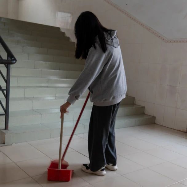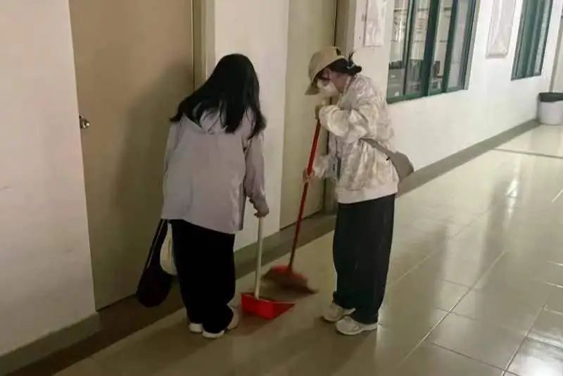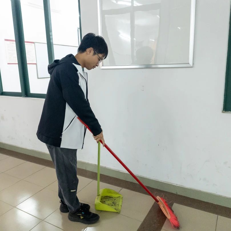 在小组长的带领下,志愿者对机房周边区域进行了细致的分工之后,便拿起“作战工具”,开始认真打扫走廊、楼梯间和实训室等区域。