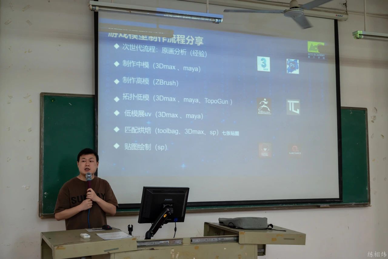 然后,何耀向同学们展示了制作流程以及各个阶段会使用到的软件,并展示了数字工坊的学员们的学习成果和教学的环境,并表示每个学员都有独立的双屏电脑进行学习。
