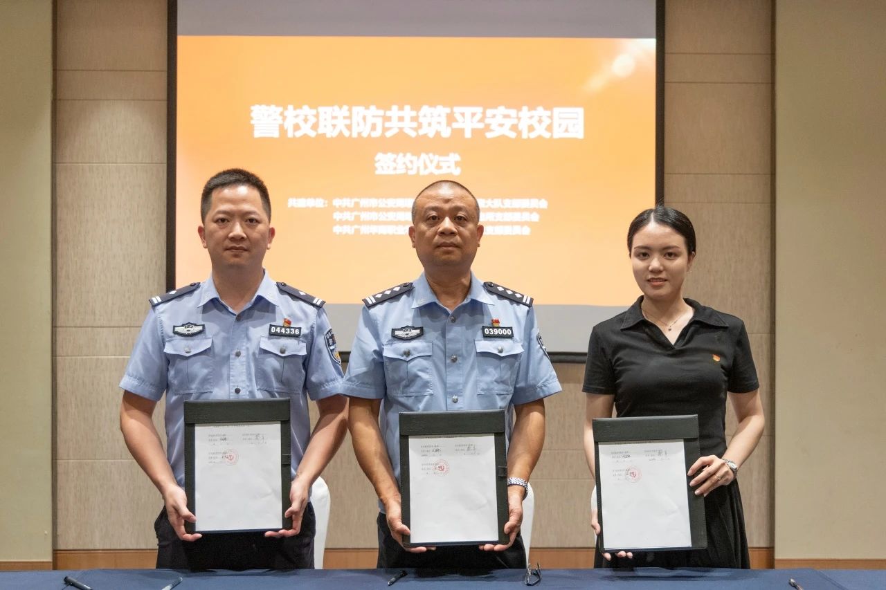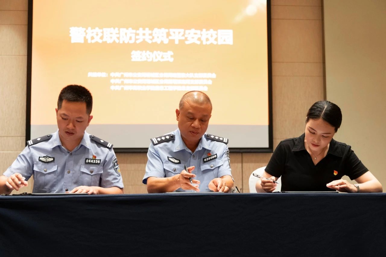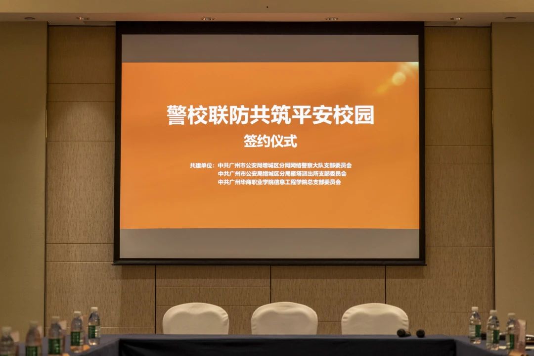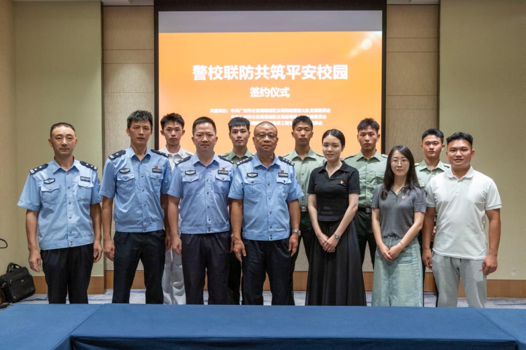 为深入落实党的二十大关于“统筹发展和安全,建设更高水平的平安中国”的要求,更好地发挥“枫桥经验”在完善校园安全治管理体系的重要作用,切实推进平安校园建设,6月18日上午,广州华商职业学院信息工程学院党总支与广州市公安局增城区分局网络警察大队党支部、广州市公安局增城区分局雁塔派出所党支部举行警校联防续约仪式。广州市公安局增城区分局网络警察大队大队长刘宇航、广州市公安局增城区分局雁塔派出所所长蔡一宇、广州华商职业学院信息工程学院党总支副书记欧曼芸出席会议并共同签署协议。