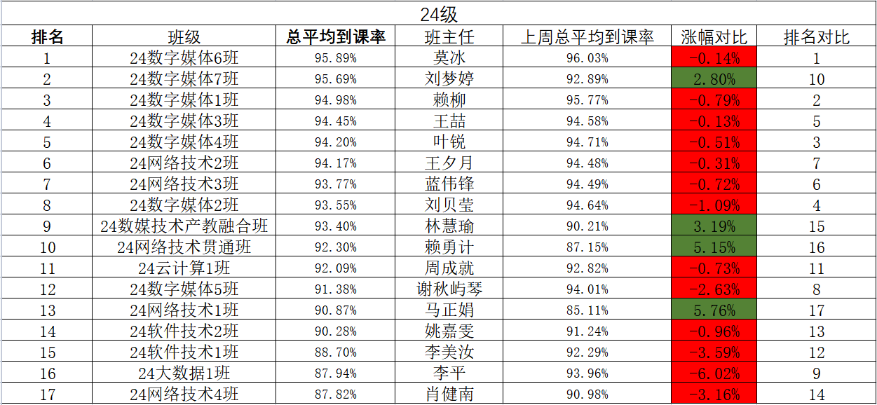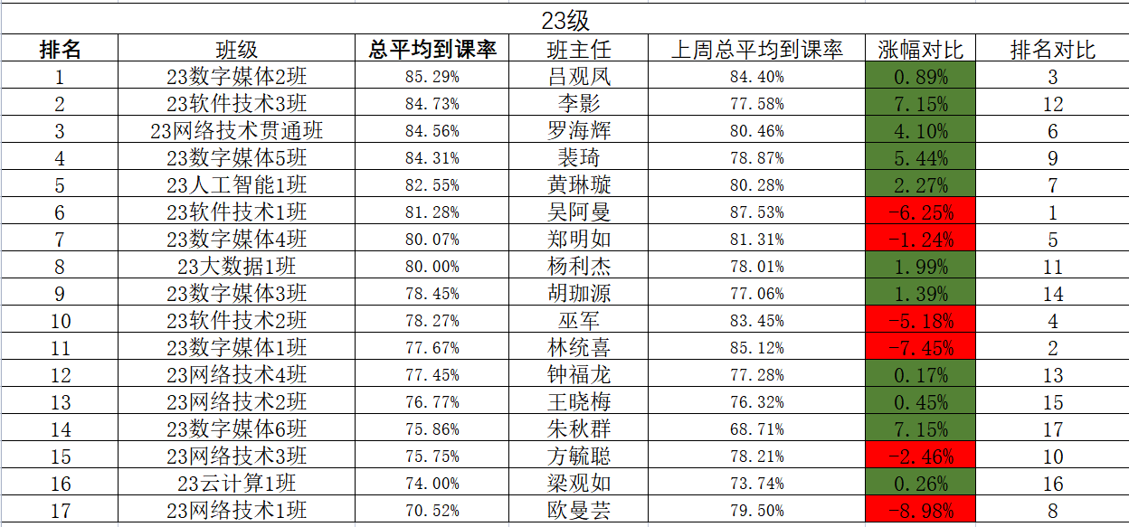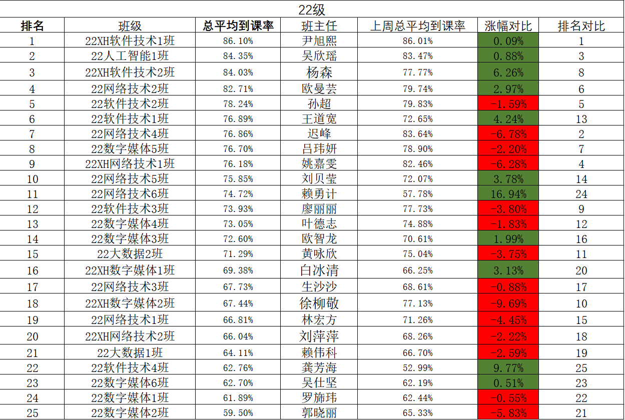 为了保证到课率,提升教学质量,因此启动高质量、高效率的点名计划,纪检部的小伙伴们为了能够准确整理出各班级数据,耐心拿着本子在教学楼的走廊穿梭着,记录下每个班级的到课情况!现将第九周到课情况公示如下: