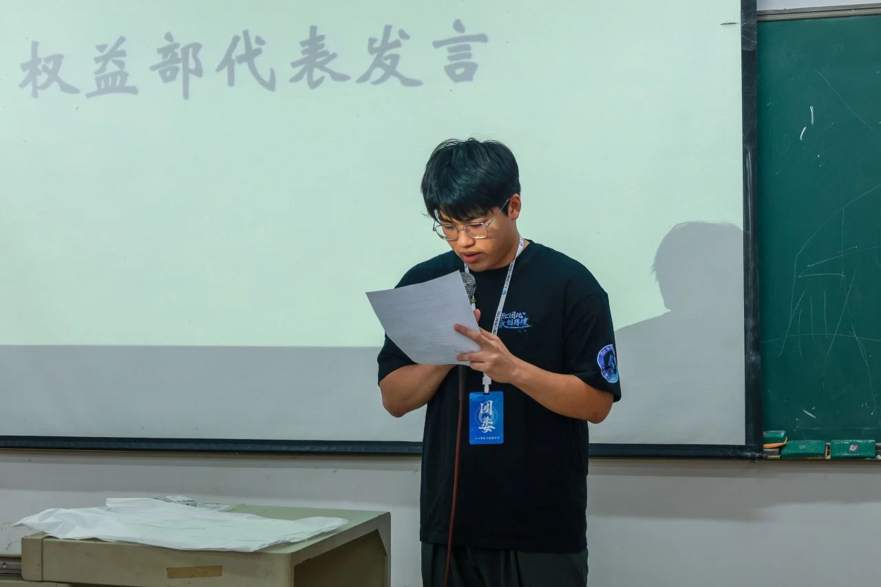 权益部部门负责人潘卓辉首先汇报了10月权益部的工作总结:10月12日,会议室整理;10月16日,教学区域打扫;10月24日,宿舍走访;10月25日,融冰联谊活动的物资准备;10月29日,运动员选拔。