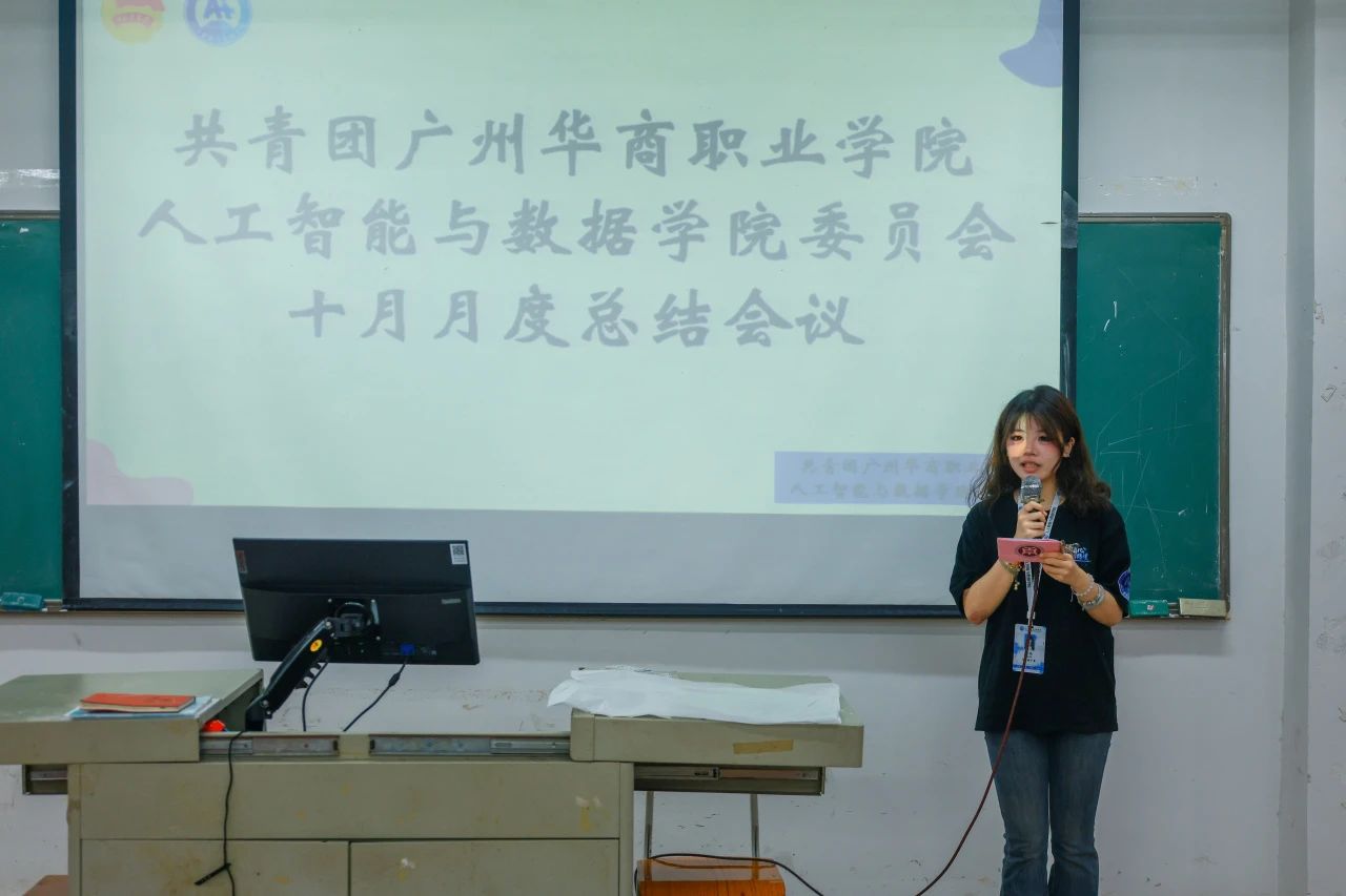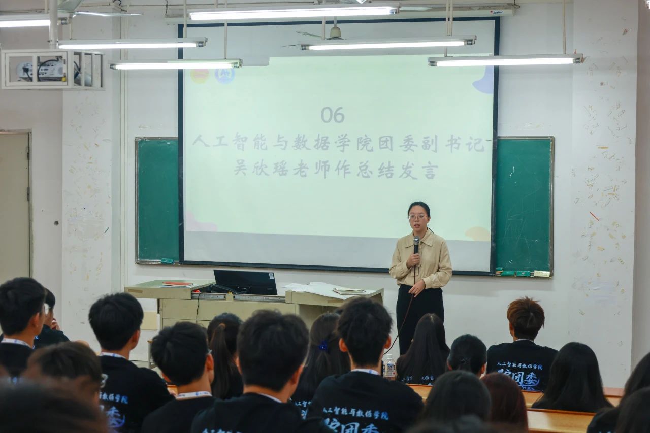 吴欣瑶老师为会议做最后总结,首先她对所有团学成员的辛勤付出和积极参与表达了诚挚的感谢。她指出大家应把在10月份的相互熟悉,在11月份变为热情。同时指出在近期的一系列活动中,部分团学成员的积极性有所欠缺,对活动的关注度和参与度也有待提升。她希望同学们可以积极地去参加各种的活动,丰富校园生活的同时也推动着自己进步,积极带动学院的发展,创造一个更好的人工智能与数据学院。