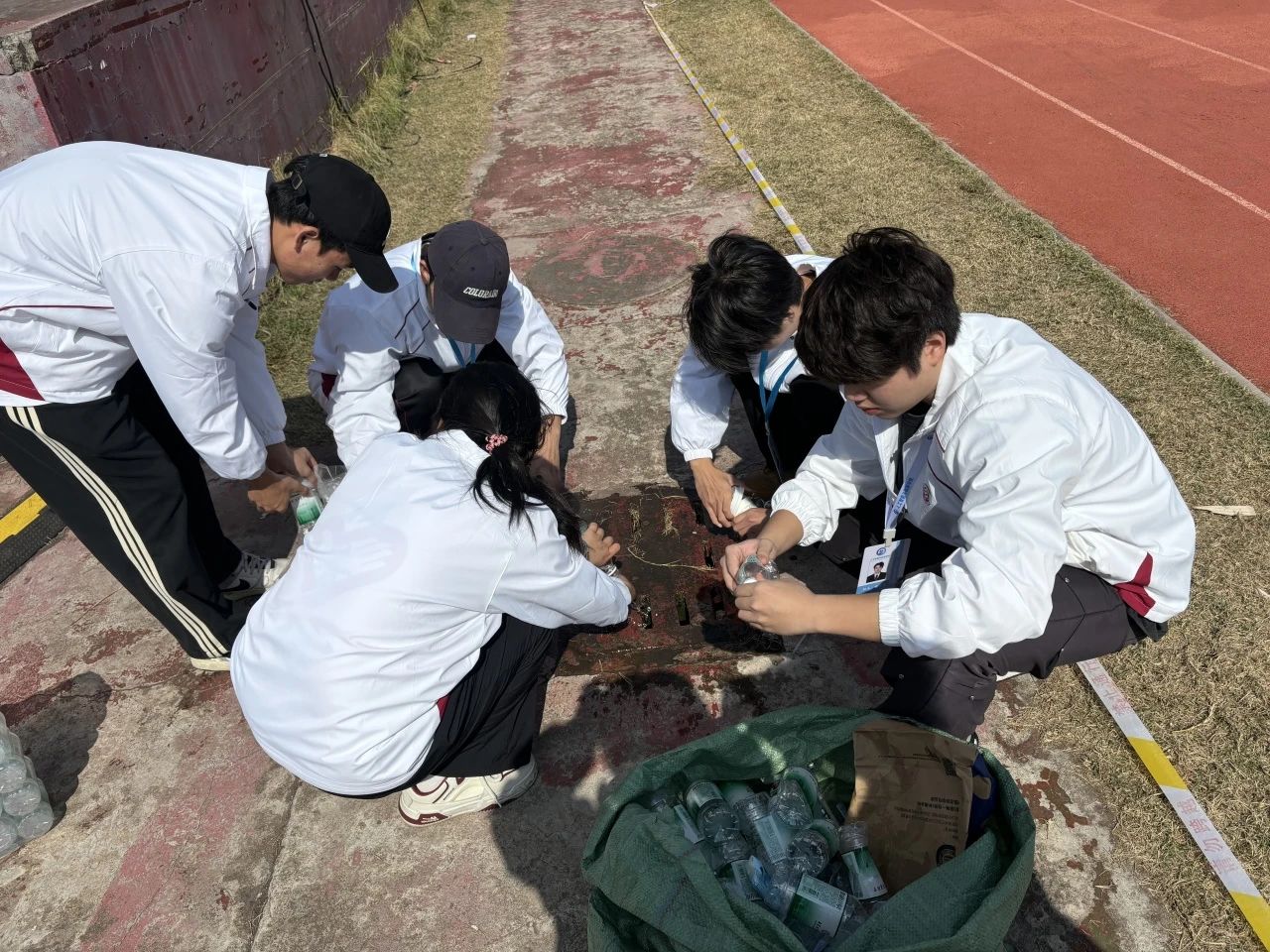 紧张而激烈的比赛结束后,志愿者们留下来进行卫生大清洁,收拾遗留在看台和草坪上的垃圾,并提醒同学们带好自己的物品有序退场。