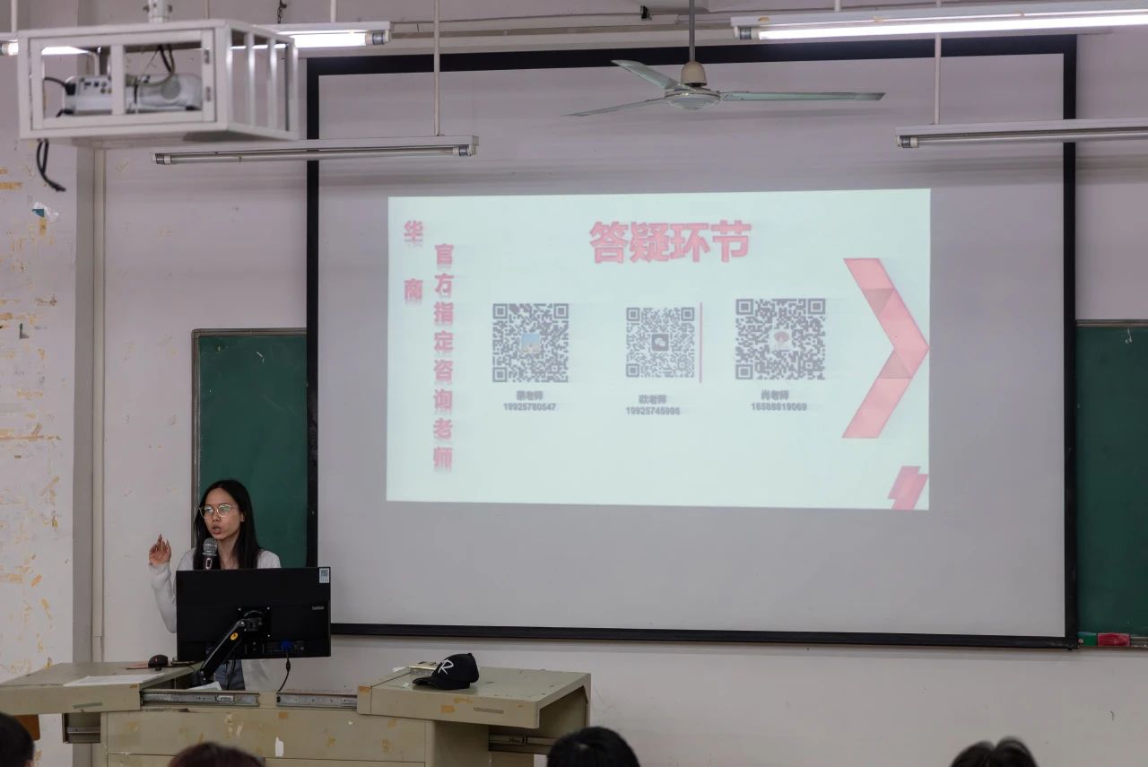 紧接着,蔡文静她说到专升本报考学校培训机构的相关福利政策。考上广州华商学院的同学可以退还报考费用;考上公办本科可以申请奖学金等,而且她表示报班可以更好地去学习,机构也会提供题库、网课等。