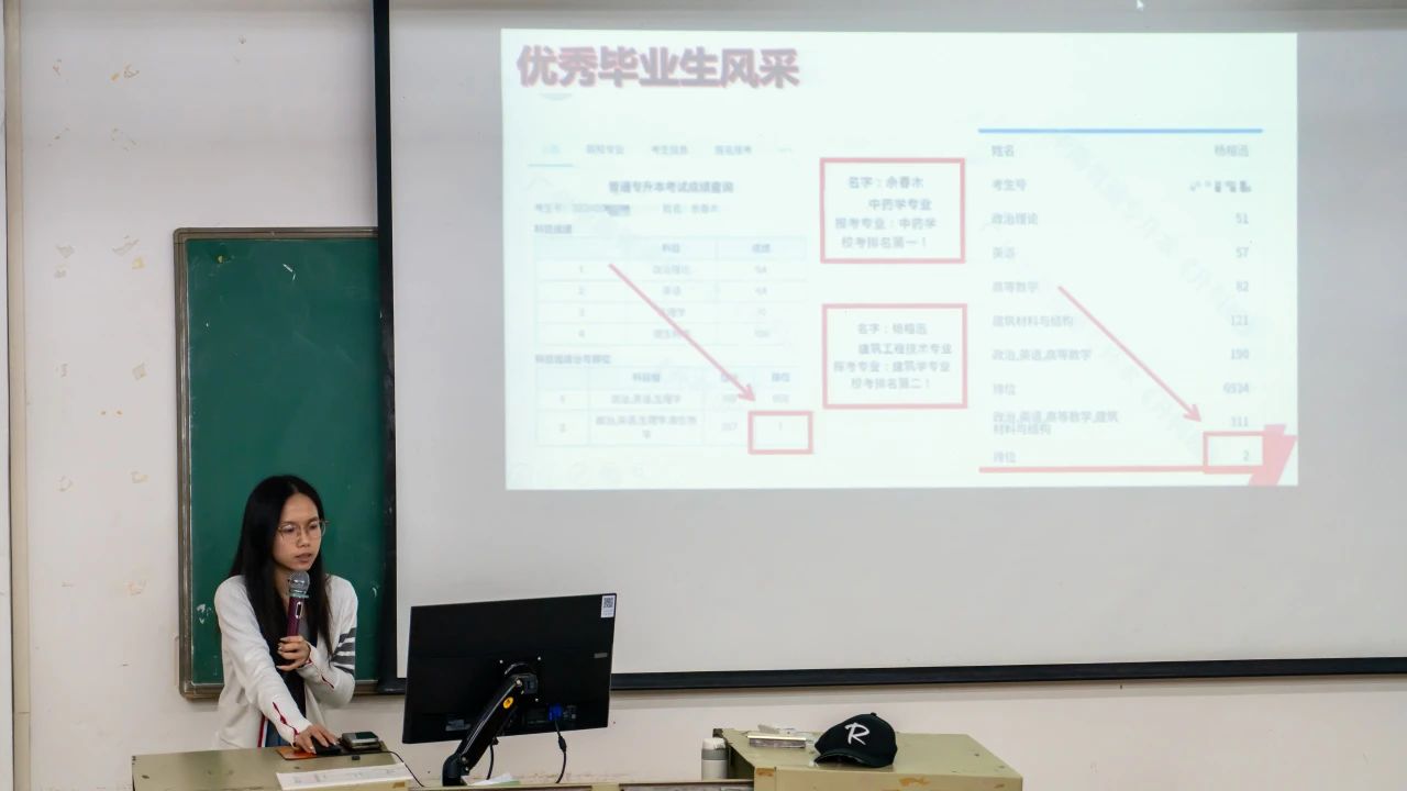 最后,她展示往届师兄师姐的优秀成绩给同学们观看。同时,蔡文静也希望同学们可以一次就过,考上理想的学校。