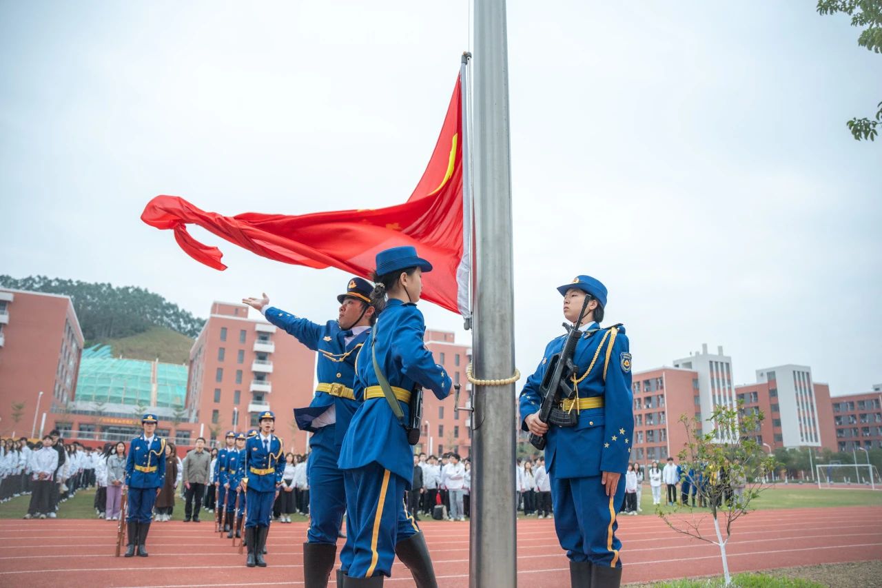 清晨 7 时 15 分,出旗指令下达,国旗护卫队步伐整齐、铿锵有力,身姿矫健、目光坚毅,护送五星红旗稳步迈向升旗台。在激昂雄壮的国歌声中,全体师生肃然而立,行注目礼,五星红旗冉冉升起,迎风飘扬,现场气氛庄重而肃穆。