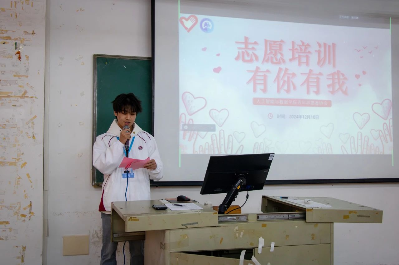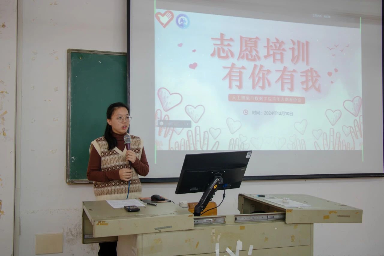 2024年12月10日中午,人工智能与数据学院院青协在博c301、博c401举办了一场别开生面的志愿者培训讲座。此次讲座采取线上线下同步进行的方式分别在两个教室开展。在这场讲座中,我们荣幸地邀请到了来自人工智能与数据学院的团委书记吴欣瑶老师,她与我们分享了关于志愿服务的深刻理解和丰富经验。