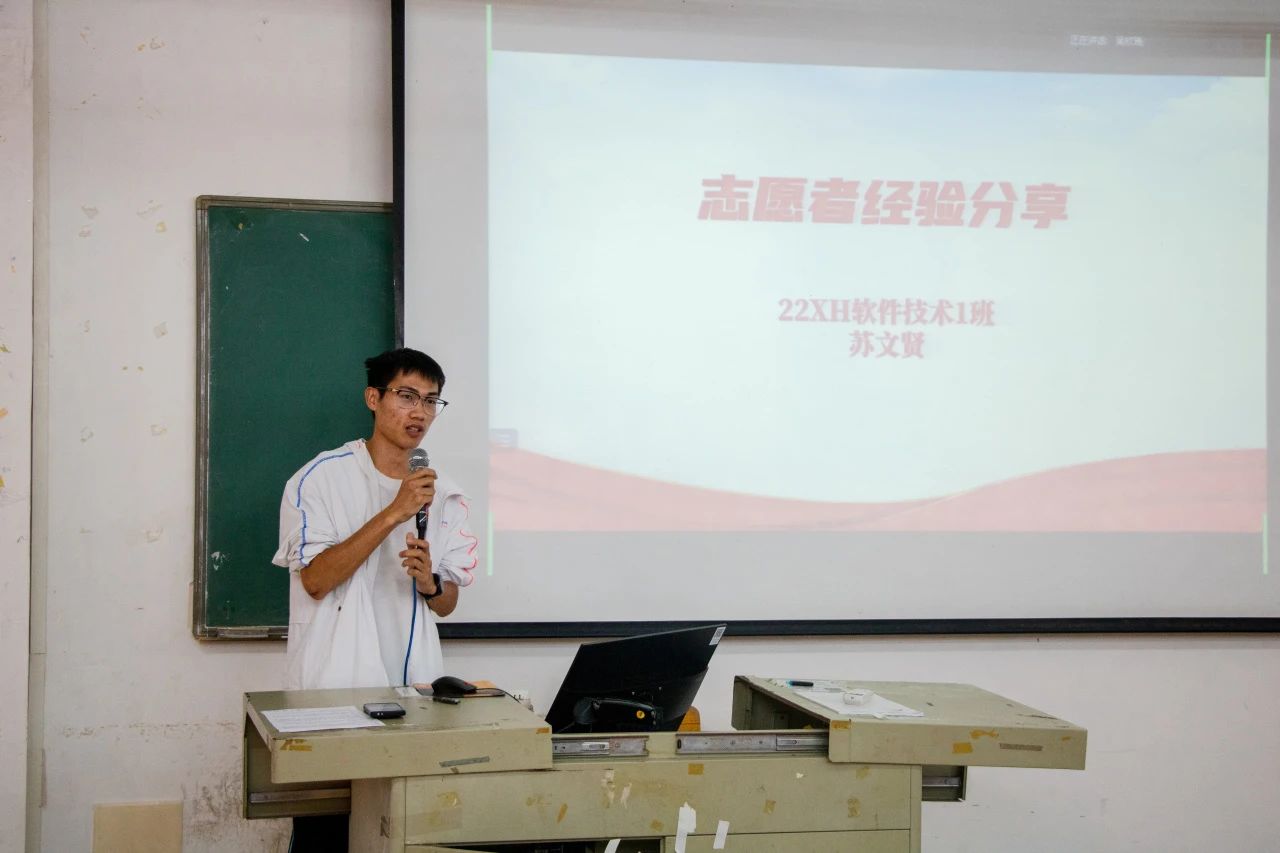 在讲座中,我们还特别邀请了苏文贤师兄进行优秀志愿者经验分享。苏文贤师兄以他的亲身经历为例,向我们讲述了他在志愿服务中的点点滴滴,以及探究如何在一次次志愿服务经历中实现自我成长并获取宝贵的人生体悟。他的故事让我们更加坚定了做好志愿服务的决心和信心。