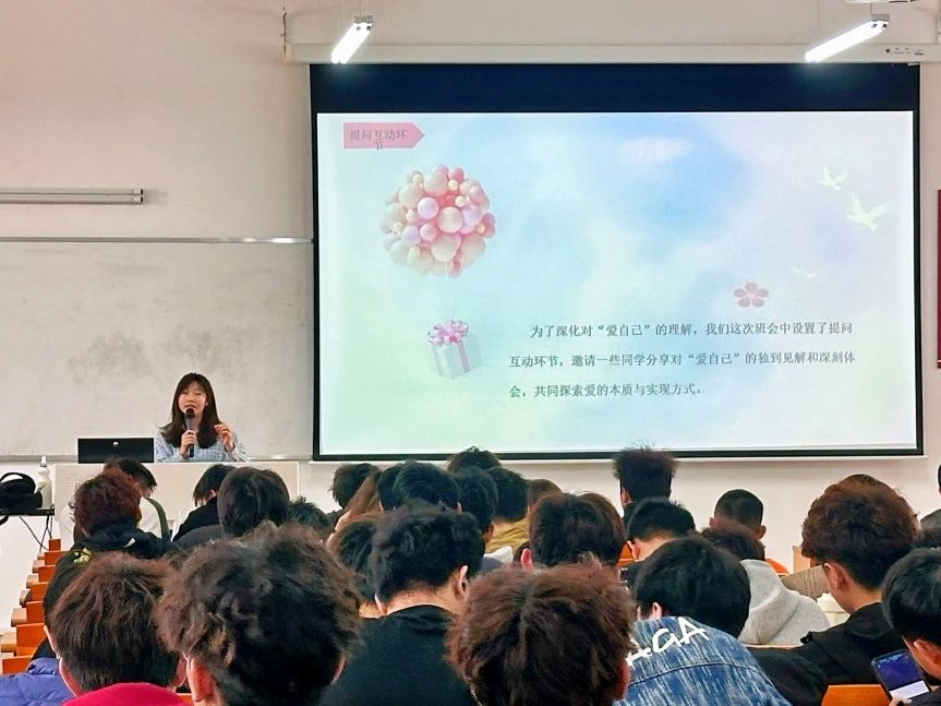本次心理健康主题班会共分为“心理健康知识普及”、“互动环节”、“爱自己的实际行动”三个环节,由人工智能与数据学院全体学生共同参与。