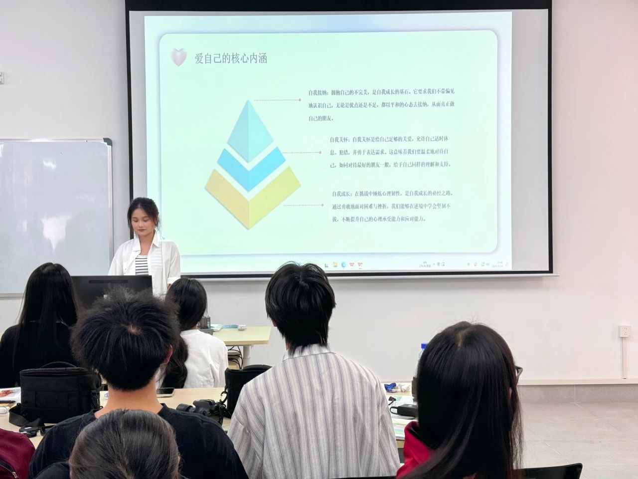 各班辅导员老师及心理委员从自我接纳、自我关怀、自我成长三个方面给同学们进行心理健康知识科普,帮助同学们树立善待自我、关爱自我、健康成才的心理健康观念。