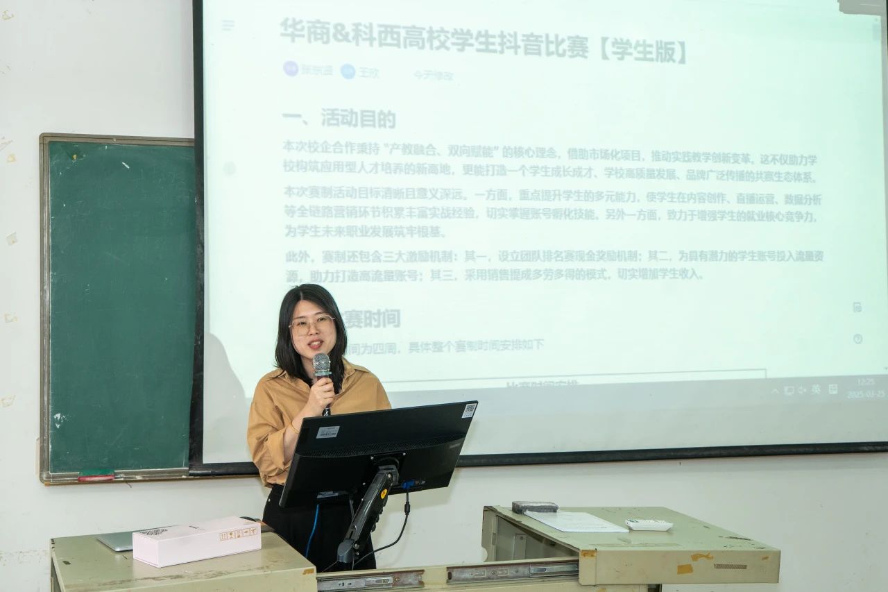 2025年3月25日,广州华商职业学院人工智能与数据学院联合广州市小海豚网络科技有限公司,在博C401教室成功举办了高校学生抖音比赛赛制交流会。本次活动旨在通过校企合作平台,深化产教融合,提升学生新媒体实践能力,为职业发展注入新动能。讲座由人工智能与数据学院张东贤老师主讲,吸引了百余名师生参与。