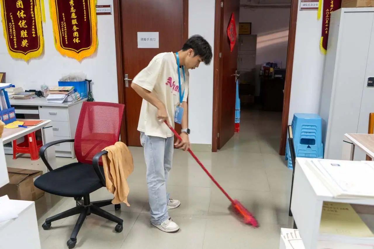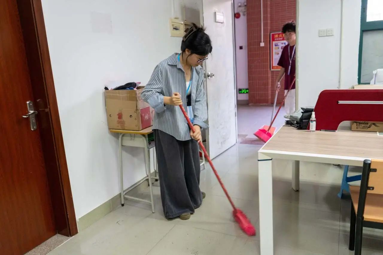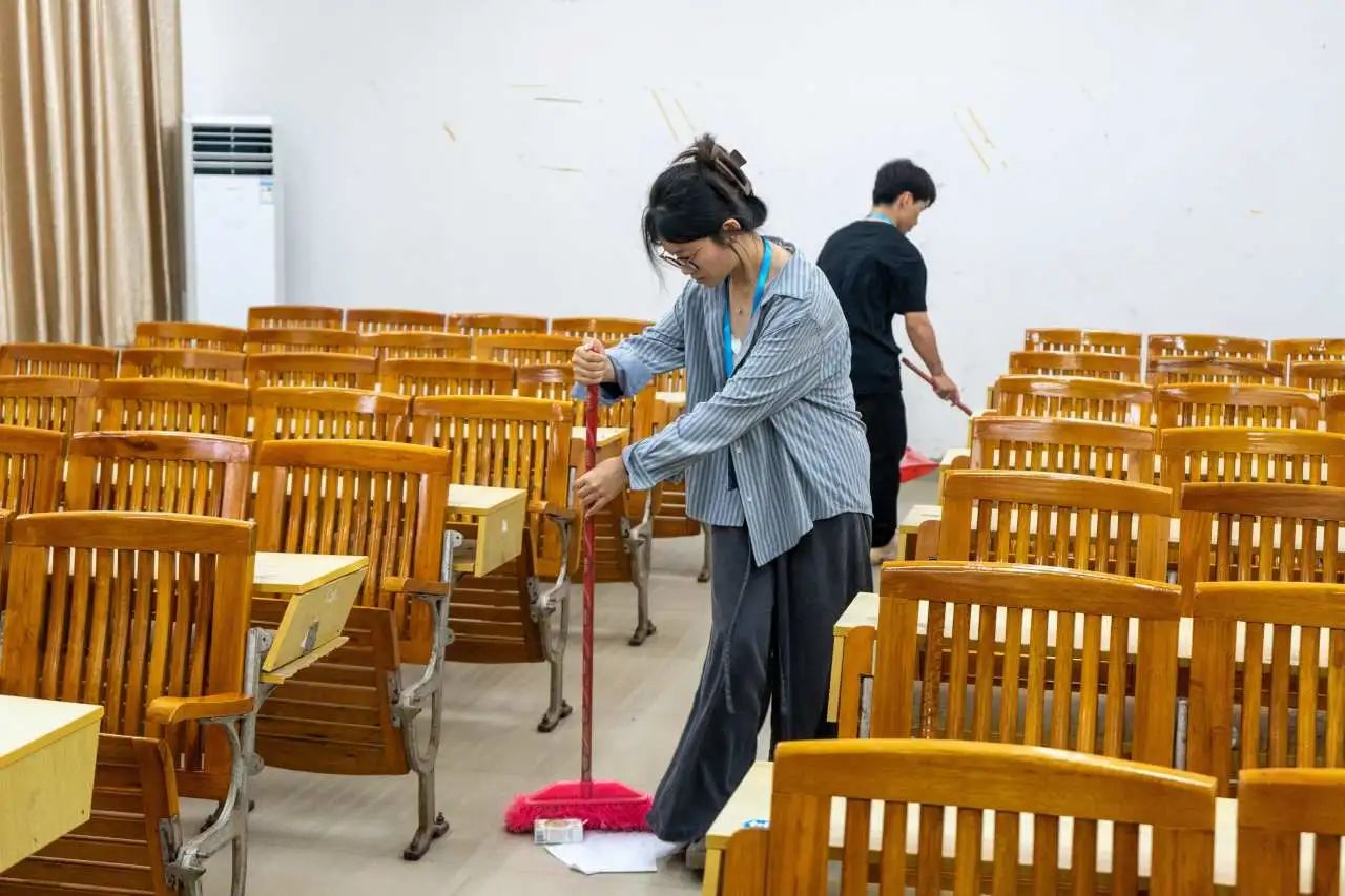 活动现场,志愿者们干劲十足,他们手持扫帚,认真、细致的打扫教室的各个角落,不忽略任何一处卫生死角