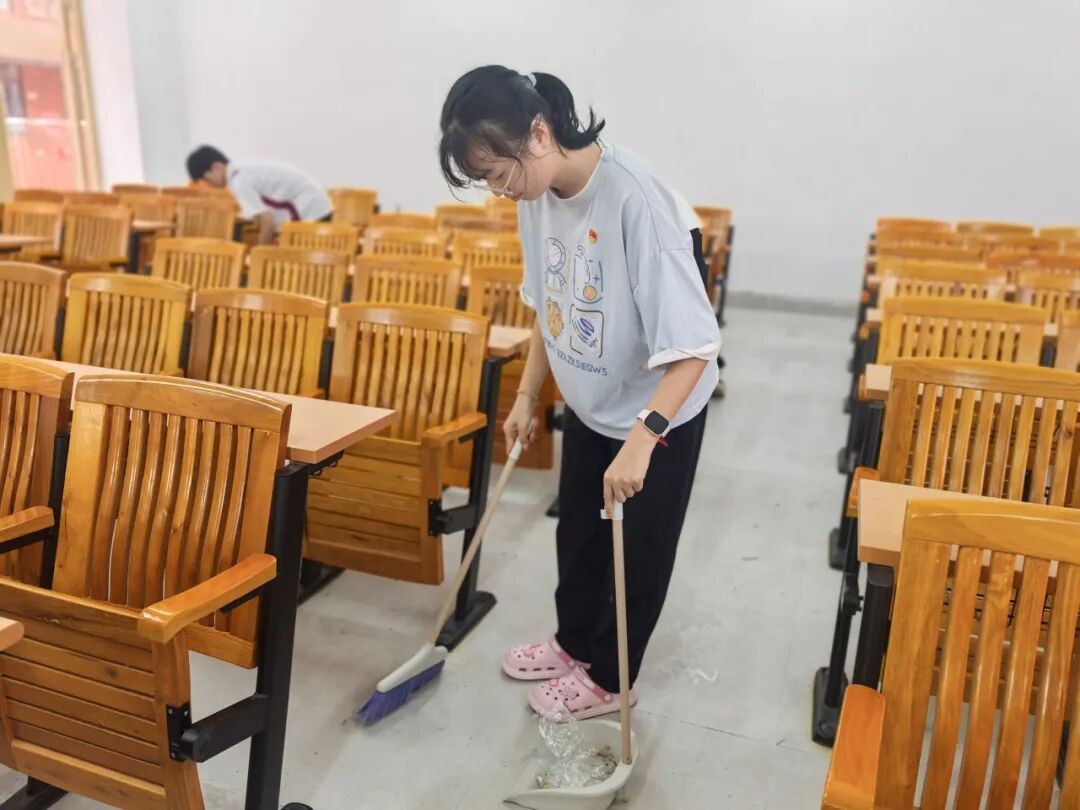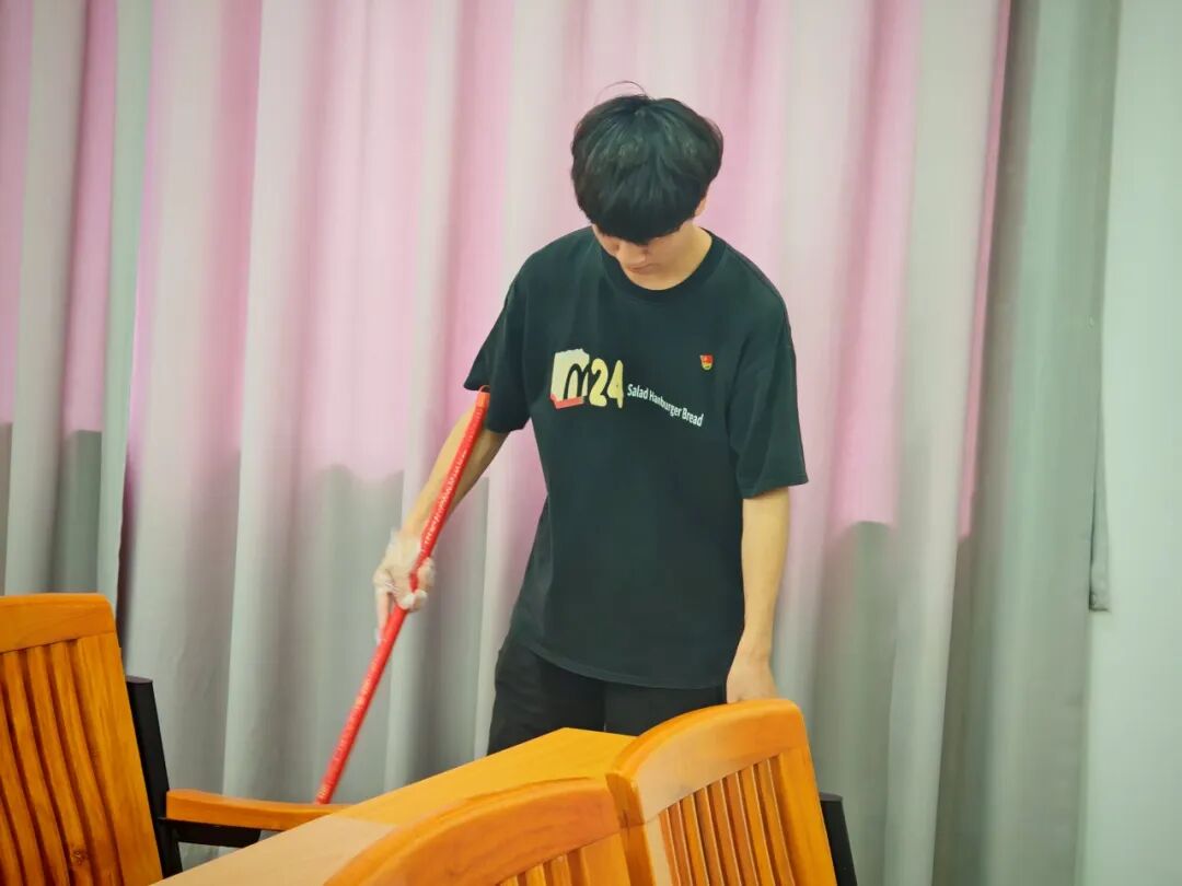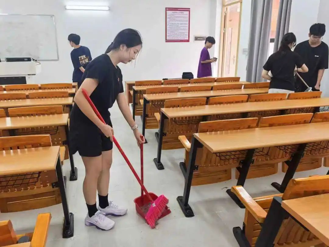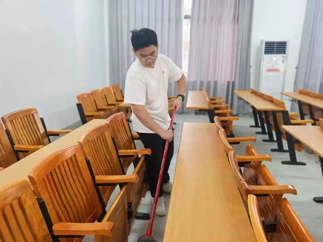 擦拭讲台与课桌、清扫地面、整理桌椅……每位志愿者分工明确、配合默契,清洁过程细致入微,力求以实际行动践行志愿精神,提升服务实效,为考生营造一个整洁、舒适的应考环境。志愿者们纷纷表示,能为同学们创造良好考试环境,感到自豪而充实。