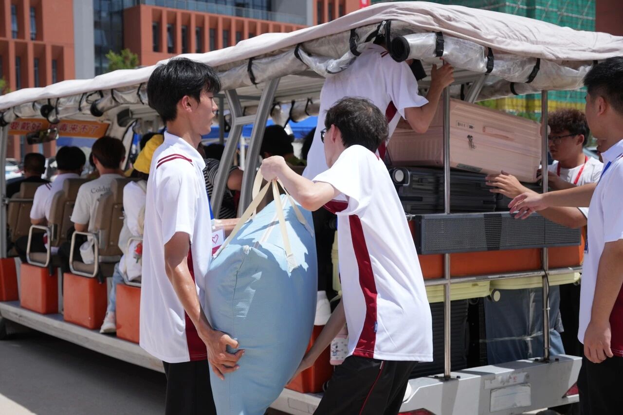 来自全国各地的大巴车与校内“小黄车”接驳往返,直达宿舍楼与体育馆。宿舍内,宿管阿姨阿叔们、学长学姐与志愿者们分工明确,行李搬运与手续办理井然有序,让智数的新生们轻松实现拎包入住,快速融入校园生活。