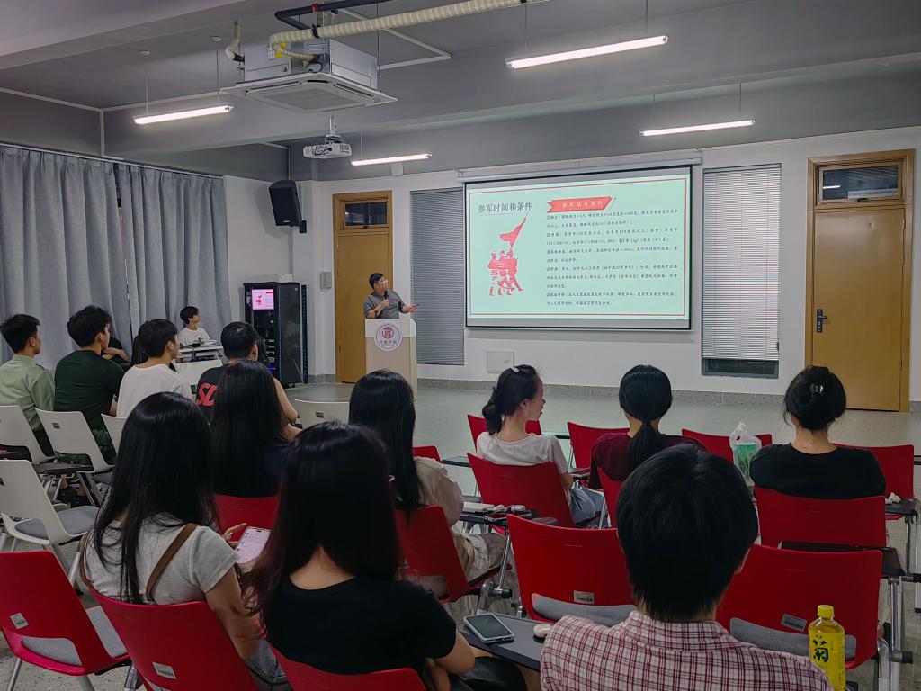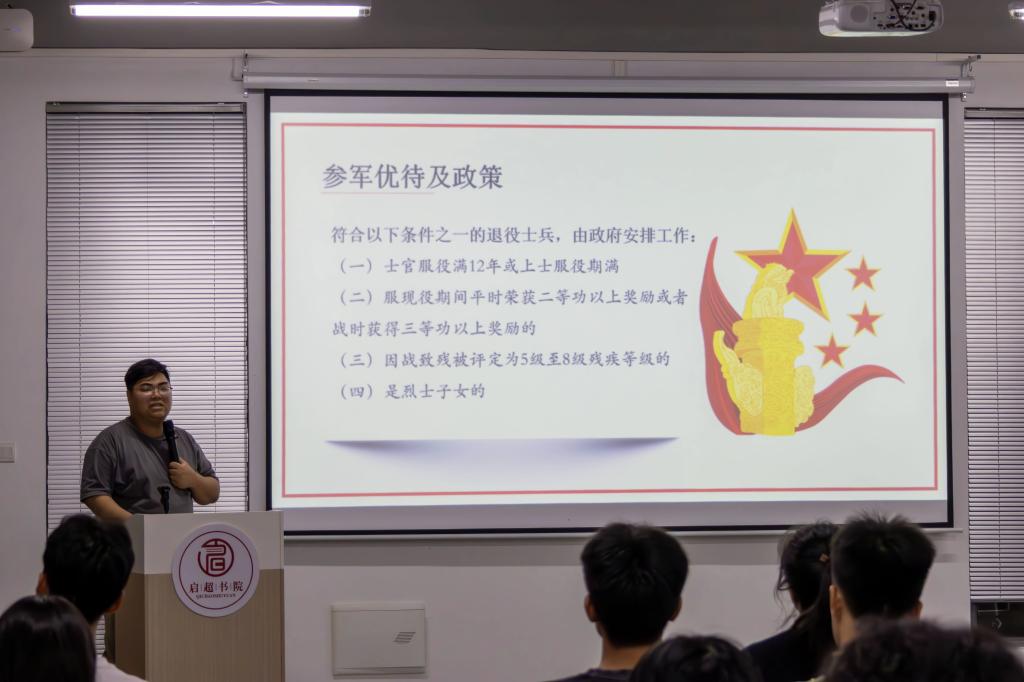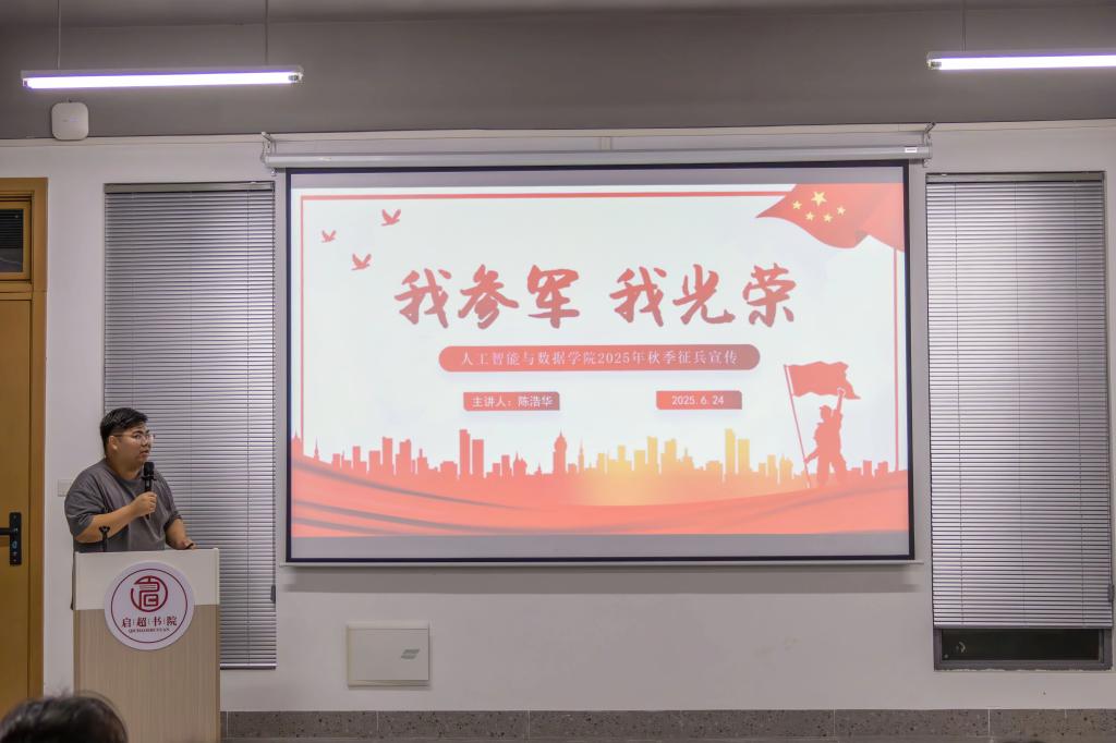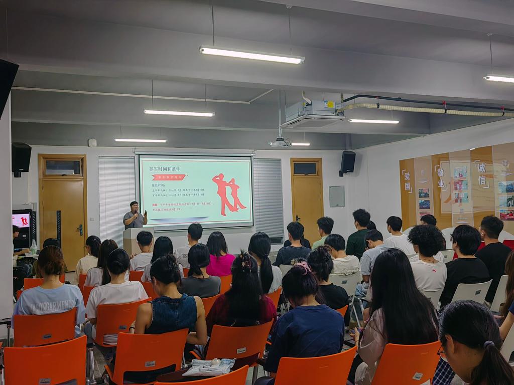 为深入贯彻习近平总书记强军思想,全面落实国家征兵工作决策部署,进一步激发青年学子爱国情怀,引导广大学生将个人理想融入强国强军伟大实践,积极响应国家征兵号召,踊跃投身国防建设事业。我院于6月24日在启超书院博雅讲演厅举办了征兵宣讲讲座,帮助同学们全面了解有关参军的相关内容。讲座内容丰富,互动环节活跃,展示了参军对个人成长和社会发展的深远影响。本次讲座由陈浩华老师主持。