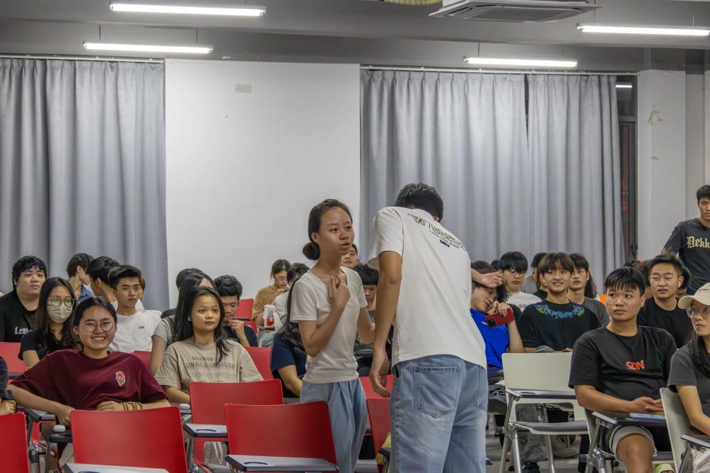 退伍学生梁海钊凭借扎实的政策储备,以幽默风趣的语言,将征兵政策解读变成了一场生动的分享会。他从参军基本条件切入,层层深入剖析大学生入伍的独特优势,用鲜活案例讲述军旅生活对个人成长的淬炼意义;同时,针对入伍后兵种分配规则、军考政策要点等职业发展路径,以及退役复学、考研加分细则等优抚政策,均进行了细致的阐释,让同学们全面了解征兵政策。同时也满怀激情地号召:“携笔从戎,在军营挥洒热血,用奋斗书写青春华章!只要心怀壮志,就勇敢奔赴国防事业,实现人生理想!”