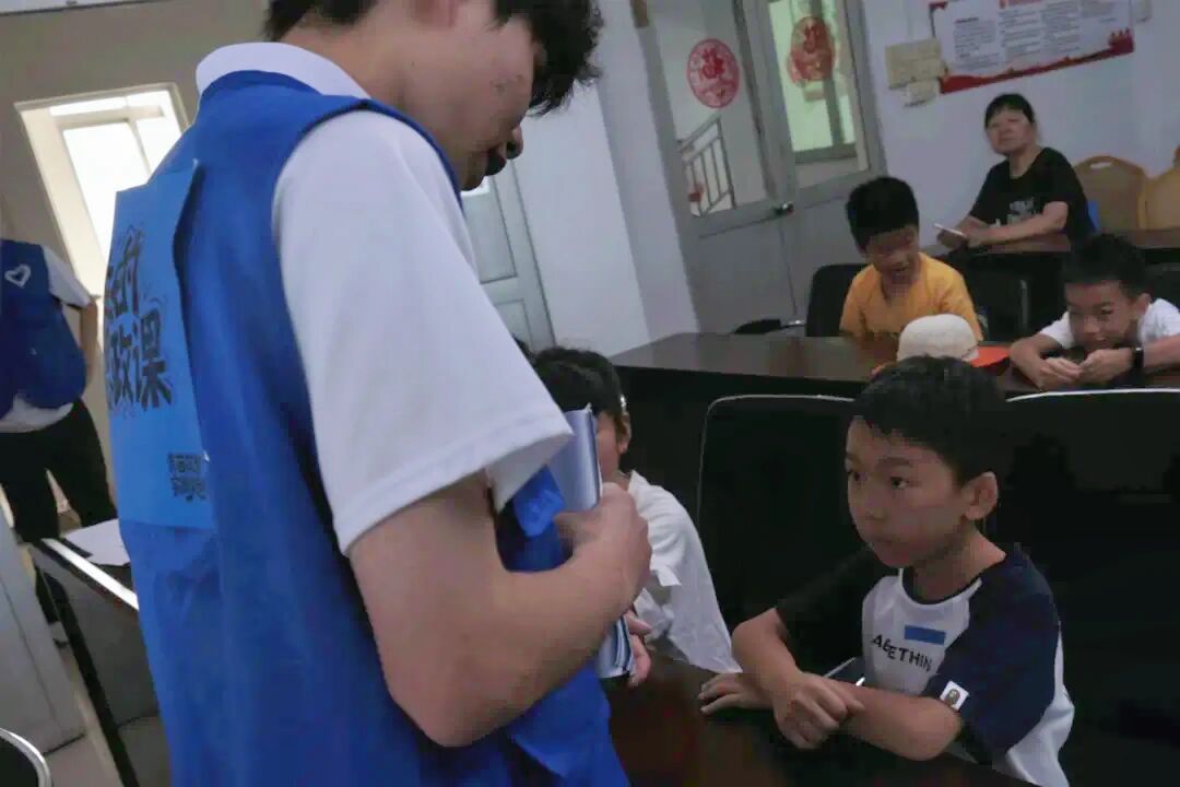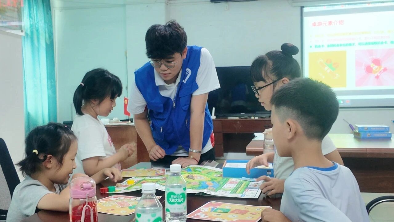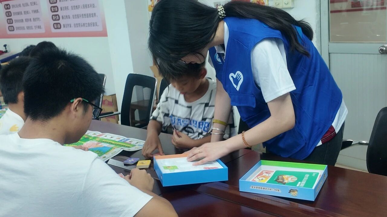 桌游时间里,志愿者们带着七八岁的小朋友们玩起简单有趣的桌游。小桌子旁,孩子们围坐一圈,跟着队员的引导拼图案、玩配对。志愿者们弯着腰教规则,温暖在你一言我一语中流淌,让紧张的探索时光多了份轻松的调剂。