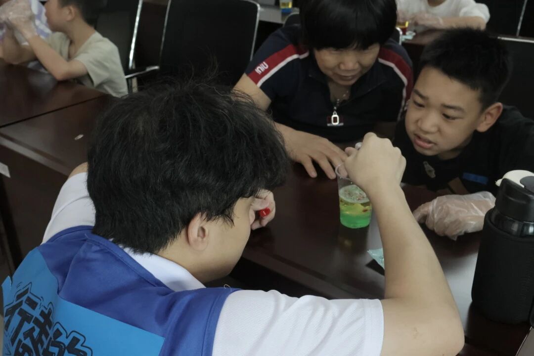 午后的科学探索继续升温,熔岩喷发实验率先登场。孩子们分组领取清水、色素和泡腾片,小心翼翼滴入红色色素,倒入食用油后放进泡腾片 ——“岩浆” 带着彩色泡泡翻滚上升,像火山喷发般壮观。