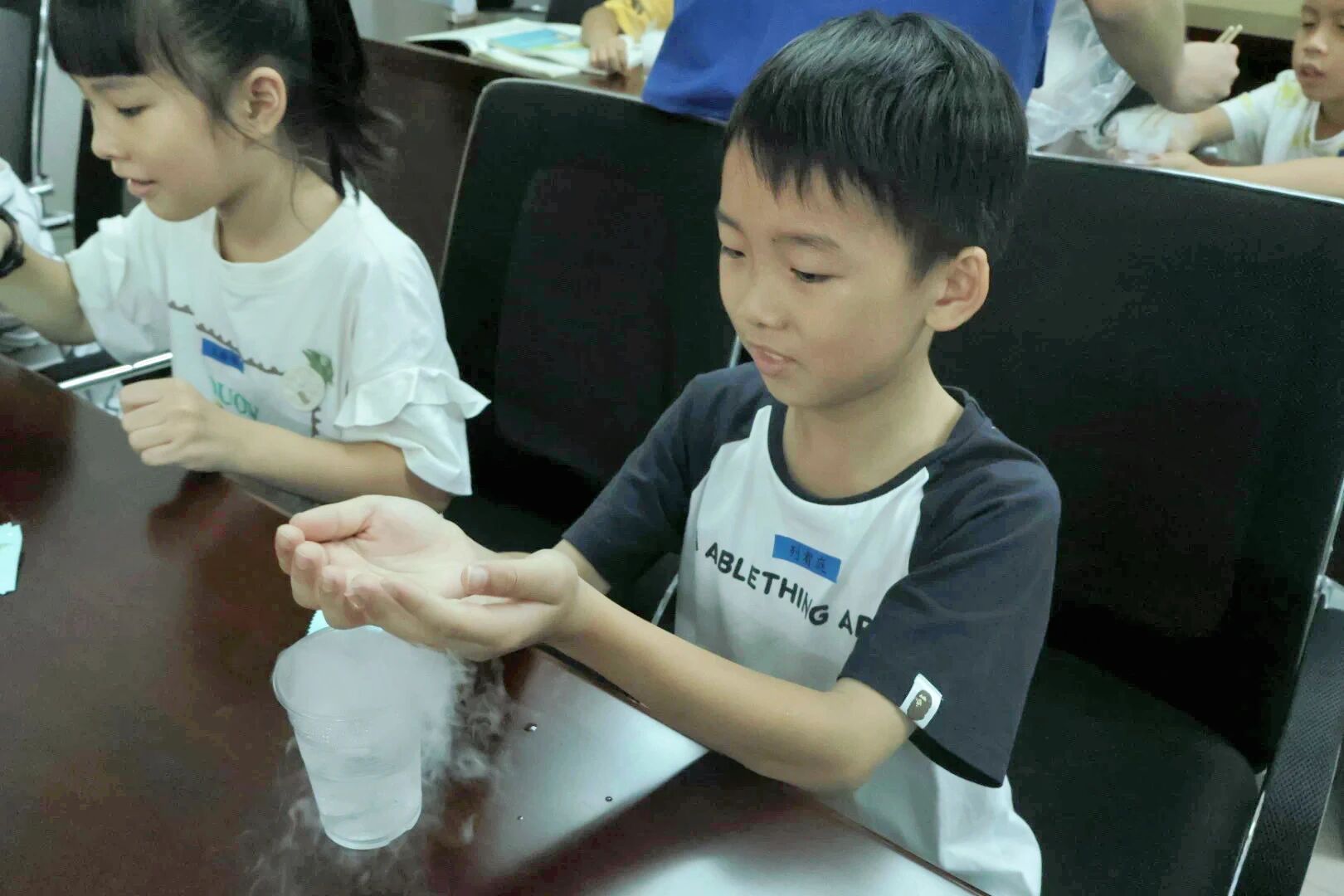 随后,在志愿者们的引领下,孩子们分组协作投入 “腾云驾雾” 实验:调配干冰材料、细心记录现象,在 “云雾缭绕” 的奇观中惊叹于干冰的神奇。志愿者们给大家普及其中的科学原理,提醒大家保持安全距离,实验的余韵里,孩子们对科学的好奇愈发浓厚。