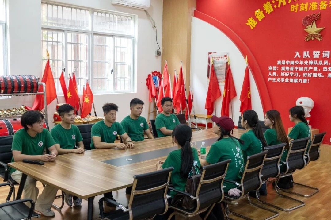 当“数字新农人”突击队的绿色身影刚踏入荔湖小学时,便立即成为了校园里一道亮丽的风景线。从校门走到会议室,队员们的步伐中满含着对即将展开交流的期待。这不仅是一场青春与校园的美丽邂逅,更是“百千万工程”中城乡联动、校地协同实践的生动缩影。在会议室里,红色旗帜的辉映下,徐柳敬老师正聚焦于数智赋能乡村教育,为队员们细致地部署实践工作。
