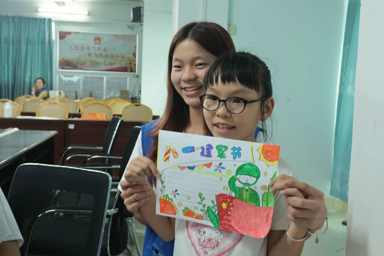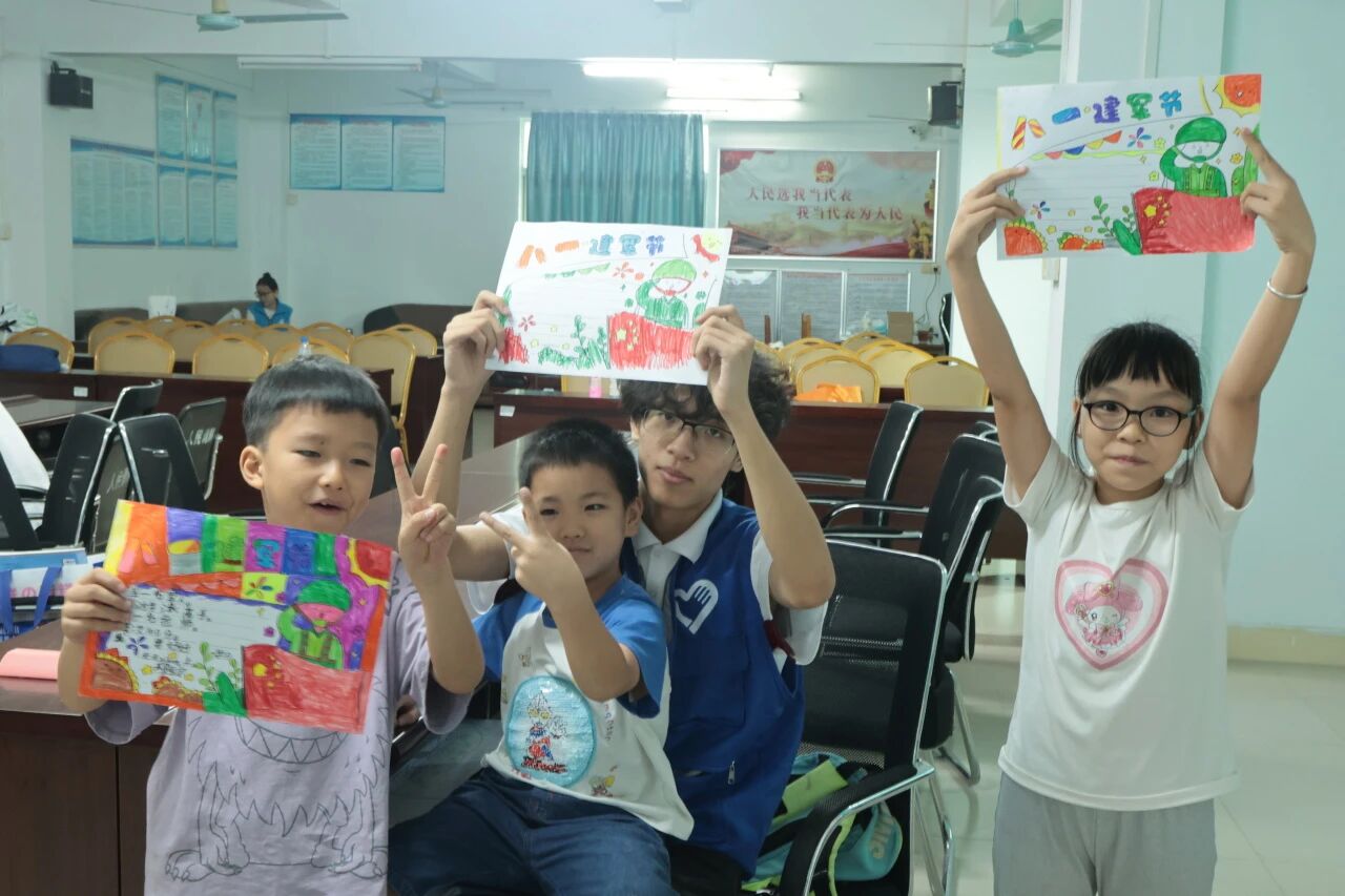 孩子们围坐桌前,为八一建军节海报上色:军帽的橄榄绿、勋章的金红色、五星的明黄色在笔尖流转。有人专注地给战士画像添上 “坚强的眼神”,有人特意把红旗涂得格外鲜艳。画笔起落间,军人的伟岸模样渐渐清晰,这抹色彩里藏着的,是童心对英雄最纯真的敬意。