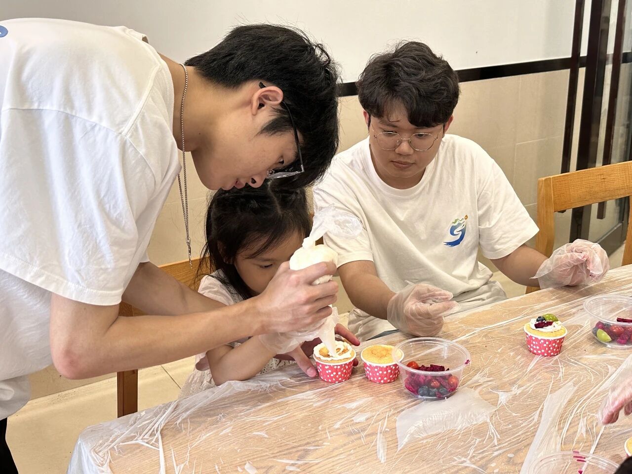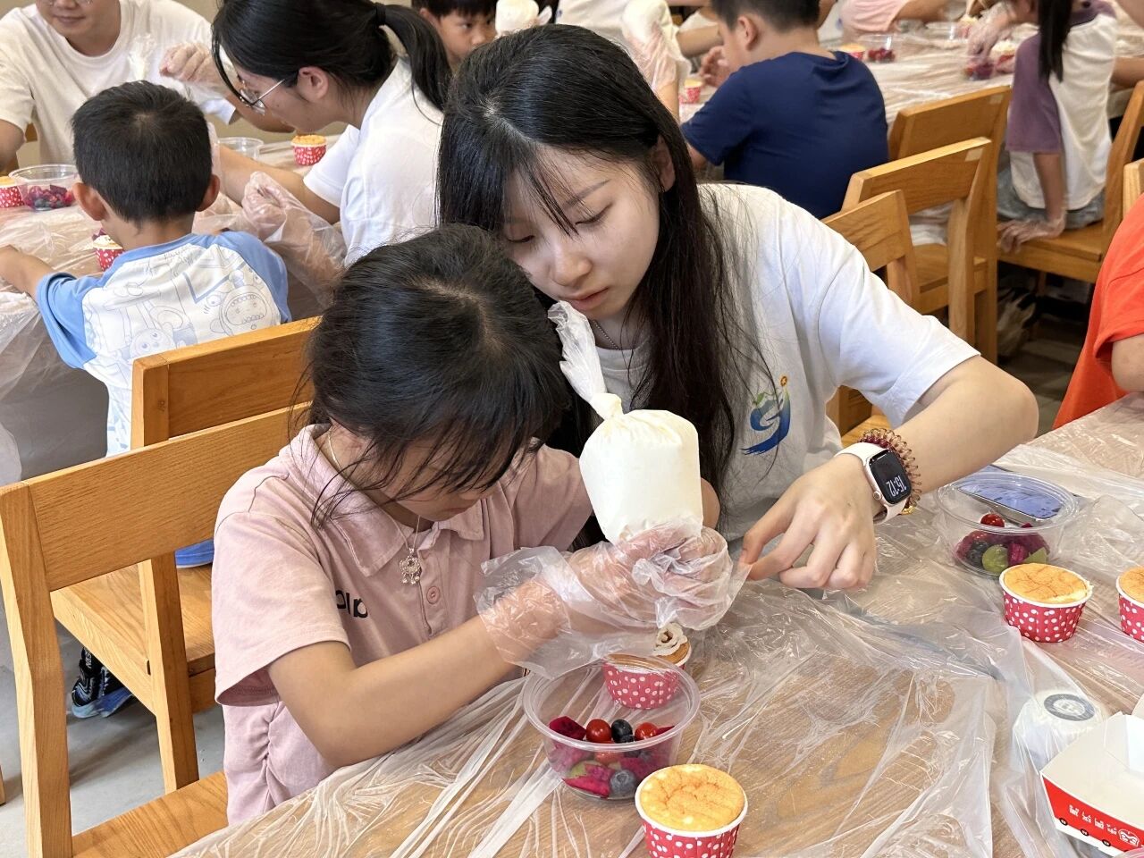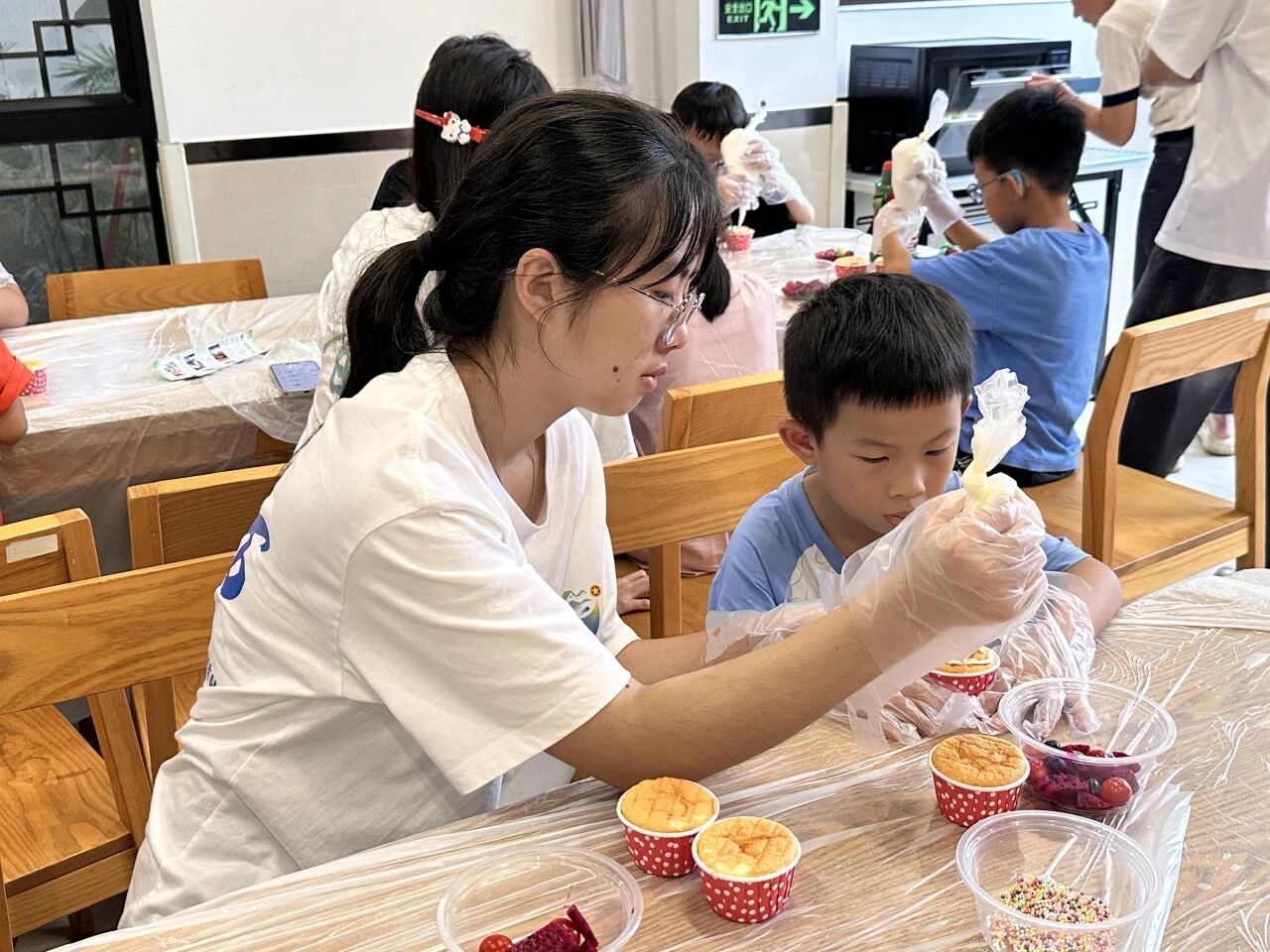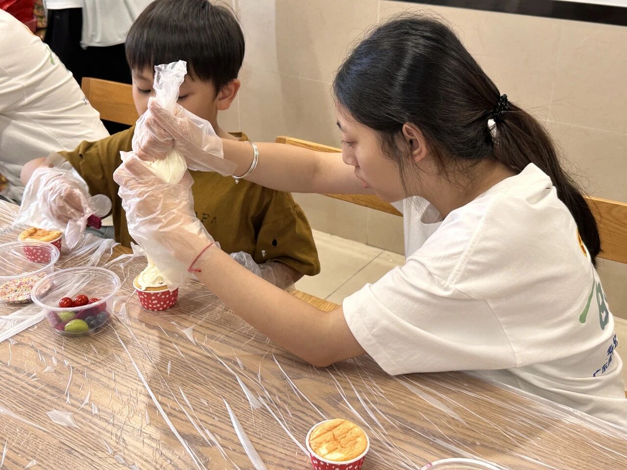 “趣味小厨房” 更是让大家体验到了自制美食的乐趣,孩子们兴奋地围在桌前,和队员们一起拿起裱花袋,尝试着挤奶油。有的孩子力道没掌握好,奶油像小瀑布一样从蛋糕侧面流下来,引得大家哈哈大笑;有的则小心翼翼地在蛋糕顶部挤出一个个圆圆的小花,队员们在一旁耐心地指导,帮他们调整角度。大家还找来各种水果丁、彩针糖作为装饰,孩子们把水果丁一颗一颗地摆在奶油上,有的摆成小笑脸,有的排成小火车,还有的在蛋挞上轻轻放上一颗鲜红的圣女果,瞬间让原本就美味的食物变得更加精致诱人。