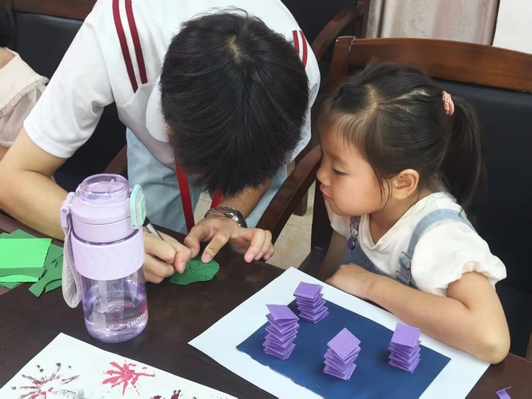 手工时间到!今天的手工课主题是“荷塘”:折弹簧作荷叶茎,剪圆片为荷叶,再贴荷花、青蛙图案。队员演示后,孩子们立刻忙活起来:有人专注折弹簧,有人交换彩纸互助,还有人举着歪扭的荷叶笑问“好看吗”。队员们耐心协助,帮捏胶带、提建议却不代劳,尽显细致与引导力。孩子们的认真、分享与坦然,正是动手能力、合作意识与创造力的体现。当立体“小荷塘”立起,绿粉交织间,每朵“荷花”都藏着独一无二的巧思。