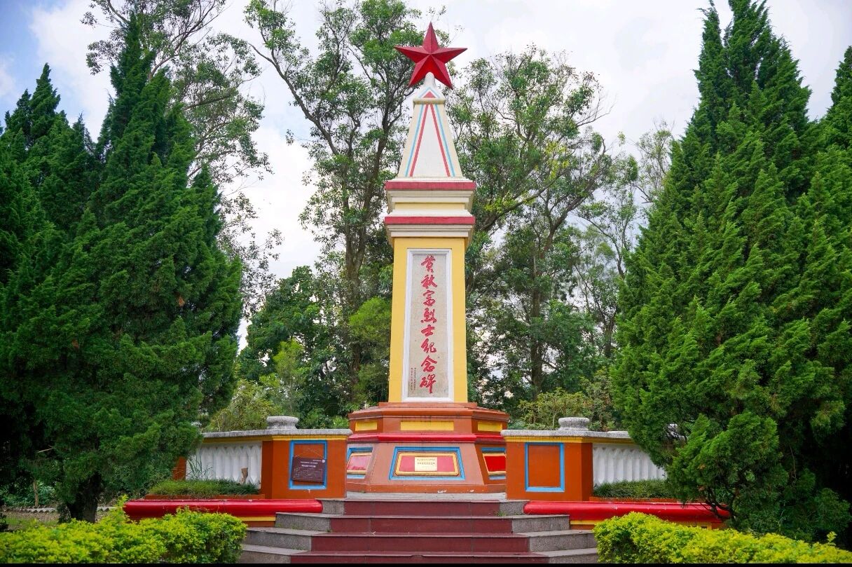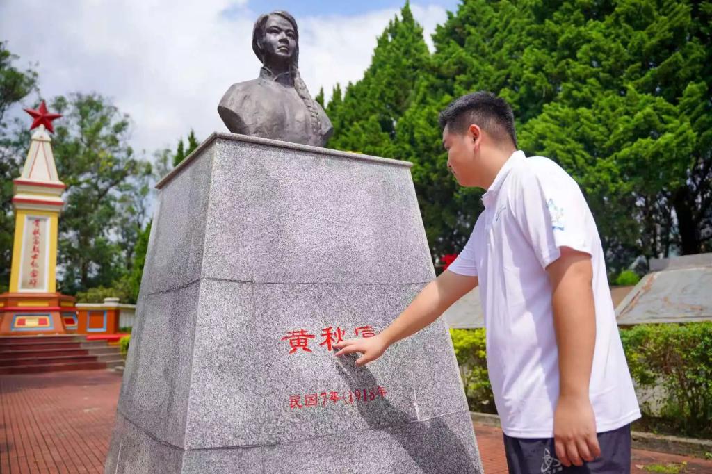怀着沉重的心情,突击队员们来到了位于凤凰圩文化广场后高地的黄秋富烈士纪念碑。苍柏环绕中,16岁少女的雕像目光坚毅,凝视着她深爱的土地。纪念碑建于1957年,2018年修缮时增设了烈士雕像和铜壁浮雕画。碑身正面镌刻着 “黄秋富烈士纪念碑” ,侧面刻有“壮烈牺牲可歌可泣”“英雄事迹世代相传”的铭文。