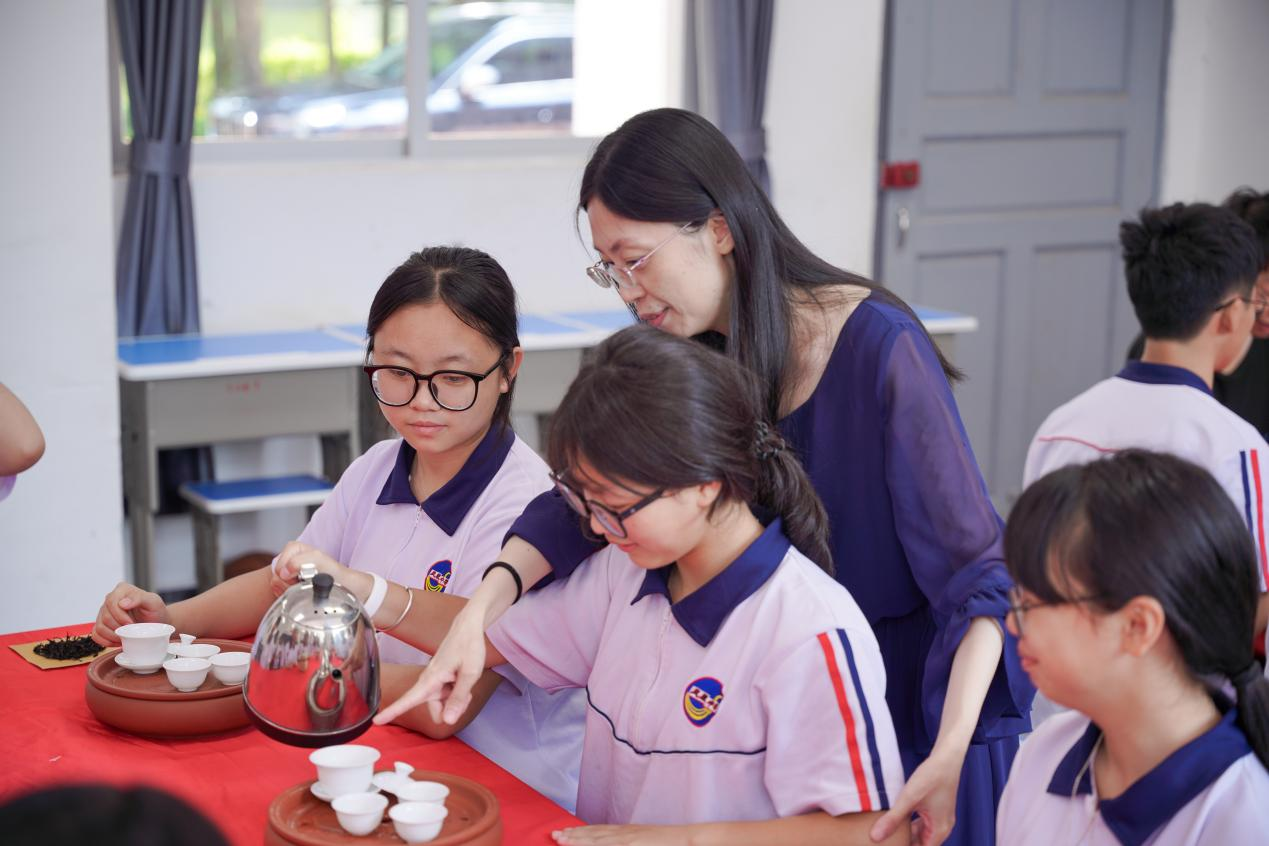 “枞启未来”突击队精心策划的“潮州工夫茶艺实训营”走进潮州市潮安区凤凰中学,以“小班匠心+手把手传承”的沉浸式实训,为茶乡学子们揭开国家级非遗“潮州工夫茶艺”的千年风雅密码。国家高级茶艺师、突击队指导老师——林琳老师亲授21式潮州工夫茶艺,“关公巡城”“韩信点兵”的千年仪轨在茶乡少年手中焕新。