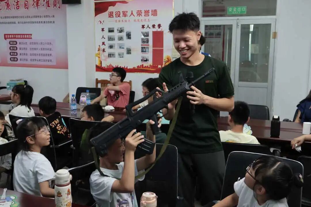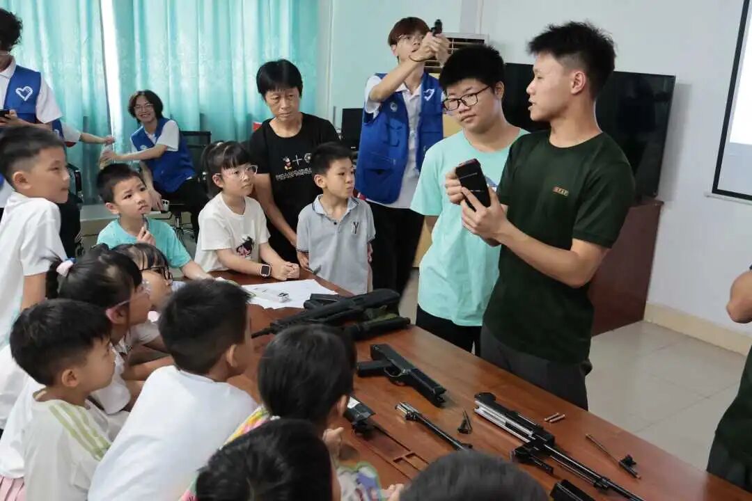 仿真枪械被一一拆解展示,志愿者细致讲解各部件功能后,现场演示拆解与组装。“原来枪的‘肚子’里有这么多零件!”孩子们围在桌前,眼神里充满好奇与惊叹。通过近距离观察,他们直观感受到国防装备的精密,对“科技强军”有了初步认知。