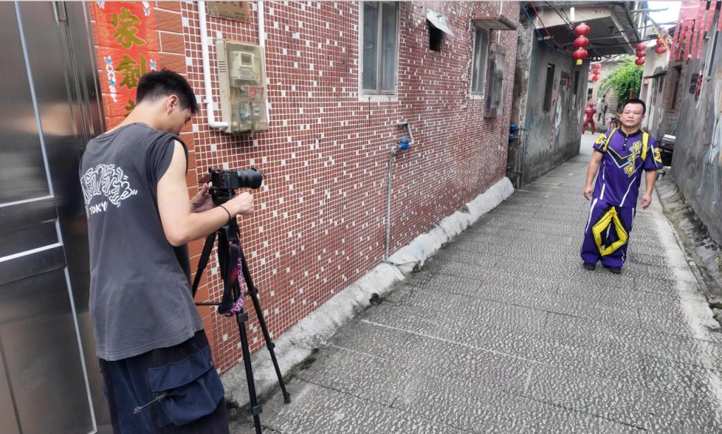 经过前期的调研与讨论,团队深入广东省江门市崖门镇京梅村,以镜头捕捉乡土人文的鲜活瞬间。拍摄过程中,成员们克服天气、场地等实际困难,灵活调整机位与拍摄节奏,将不利因素转化为独特的创意元素,确保画面语言与文化内涵高度统一。从非遗技艺的匠心传承,到蔡李佛拳分解招式的呈现,突击队成员们以专业态度与细腻视角,将静态蔡李佛拳分解动作转化为动态。随着一个个镜头的拍摄顺利完成,团队积累了大量的原始素材,为后期制作积累了丰富素材。