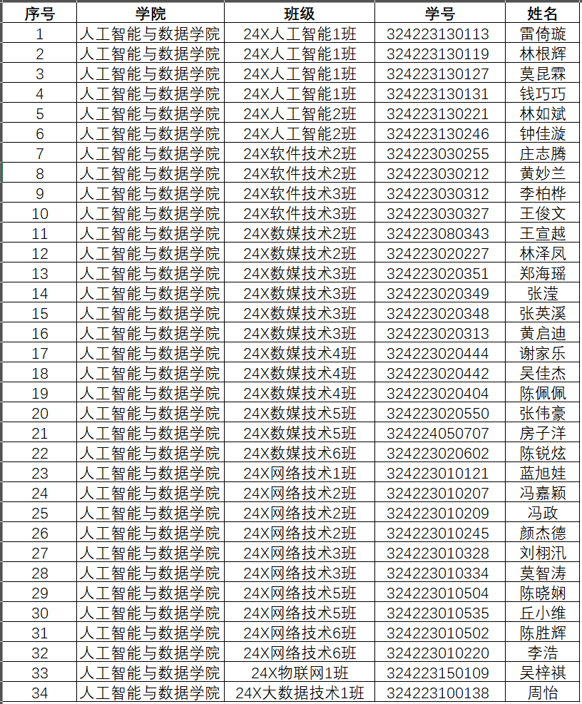 为切实做好2025级新生教育管理工作,帮助新生快速适应大学生活,充分发挥高年级“传帮带”作用。本次选拔严格中旬“公平、公正、公开”的原则,经学生自主报名、结构化面试、综合考察等多个环节层层筛选,拟聘任以下34名同学为2025级新生辅导员助理,现将名单予以公示。