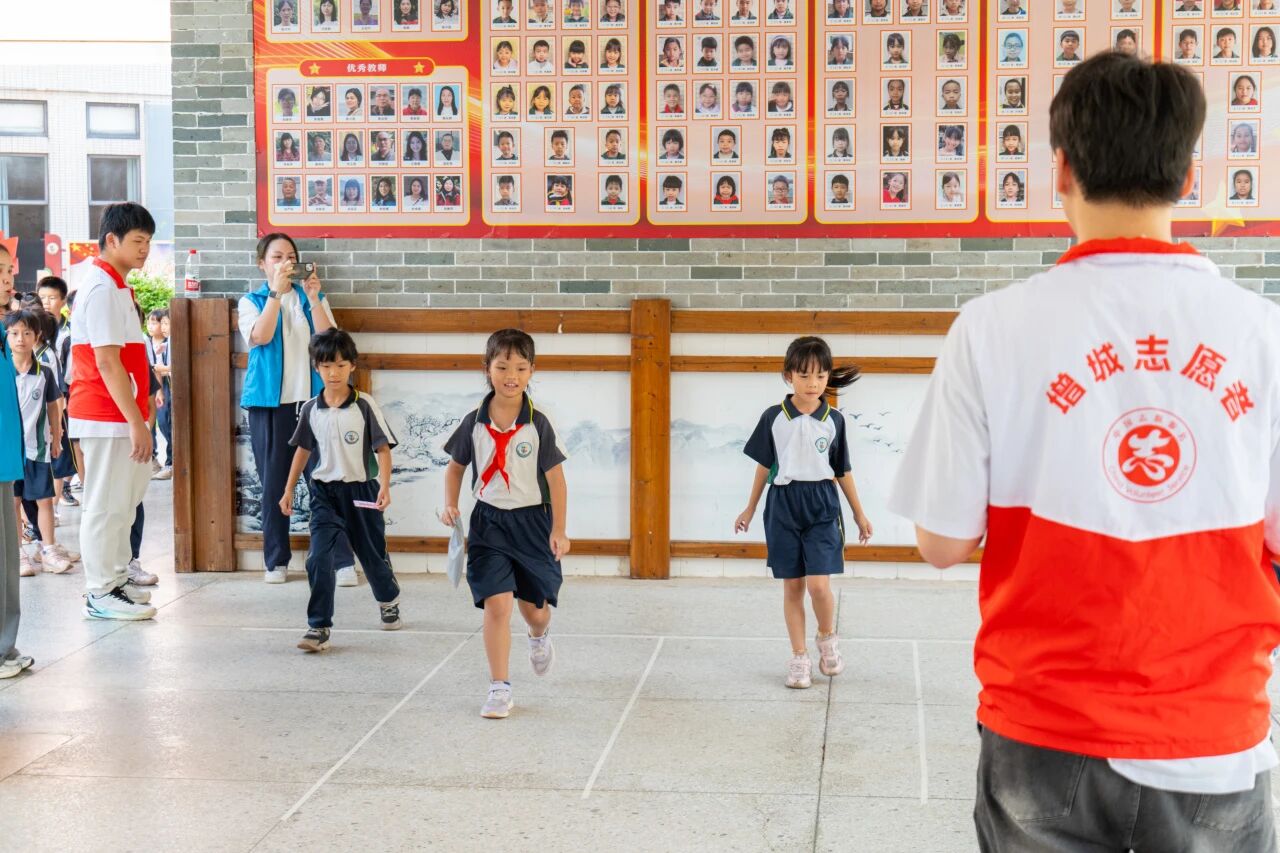 在这里,志愿者们则是挑战的见证者。无论是沙包投掷、袋鼠跳还是投壶游戏,他们总是站在一旁鼓掌、加油,为每一个敢于尝试的孩子送上肯定:“你真勇敢!”
