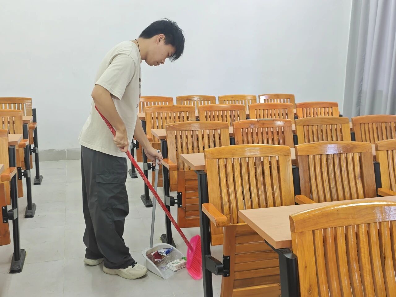 清扫过程中,志愿者们相互协作,认真细致。每一次弯腰、每一次清理,都映照出志愿服务的热情与奉献。此次活动不仅提升了课室环境的整洁度,更在无声行动中弘扬了“奉献、友爱、互助、进步”的志愿精神。