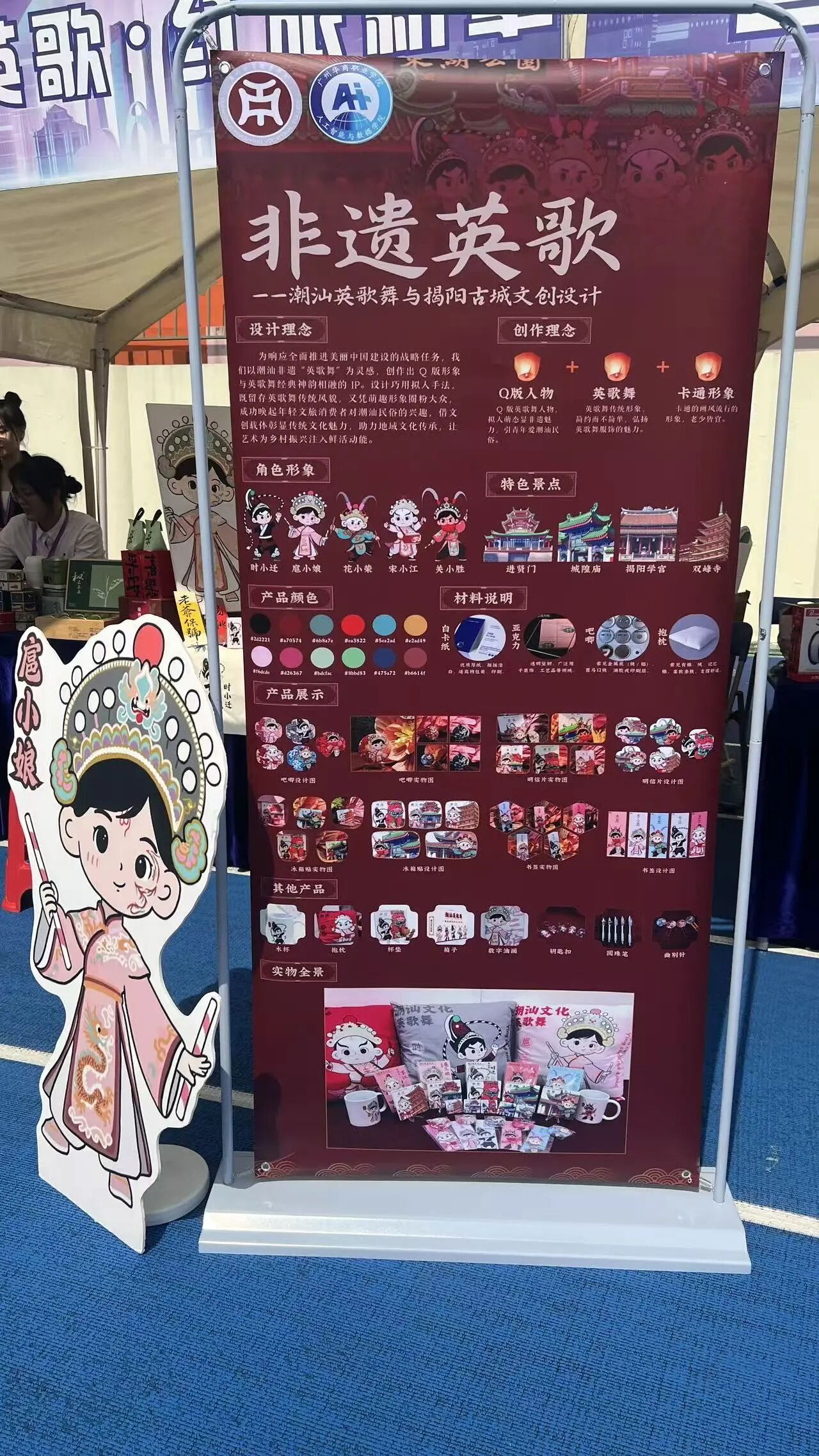 展会上,人工智能与数据学院江门校区“非遗英歌”文创项目成为最亮眼的存在之一:从抱枕、马克杯到数字油画,传统英歌舞的刚劲与Q版卡通的萌趣奇妙融合。项目负责人分享:“我们想让年轻人知道,英歌舞不是‘老古董’,它可以很潮、很可爱。”现场,不少年轻人围着IP立牌拍照,主动询问英歌舞的历史,非遗的“破圈”传播在此刻有了最生动的注脚。