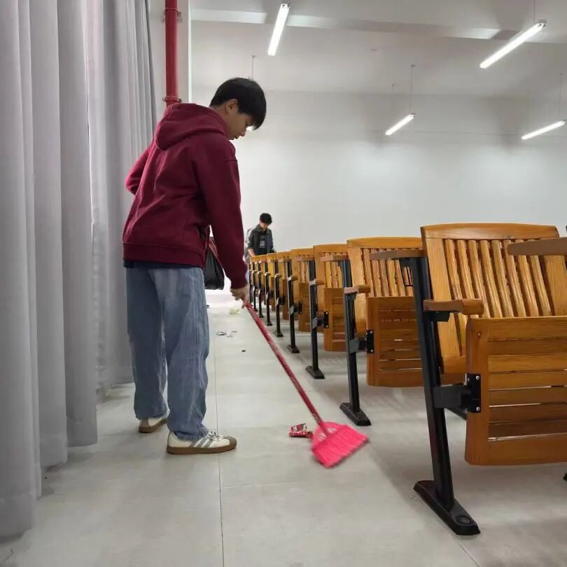 同学们手持扫帚、垃圾袋,协同配合、分工明确,以务实行动守护校园洁净;高效清扫的身影,诠释了青年学子积极进取的责任与担当。志愿清扫的每一个环节,既是对校园环境建设的切实贡献,也是青年践行服务精神的生动体现。