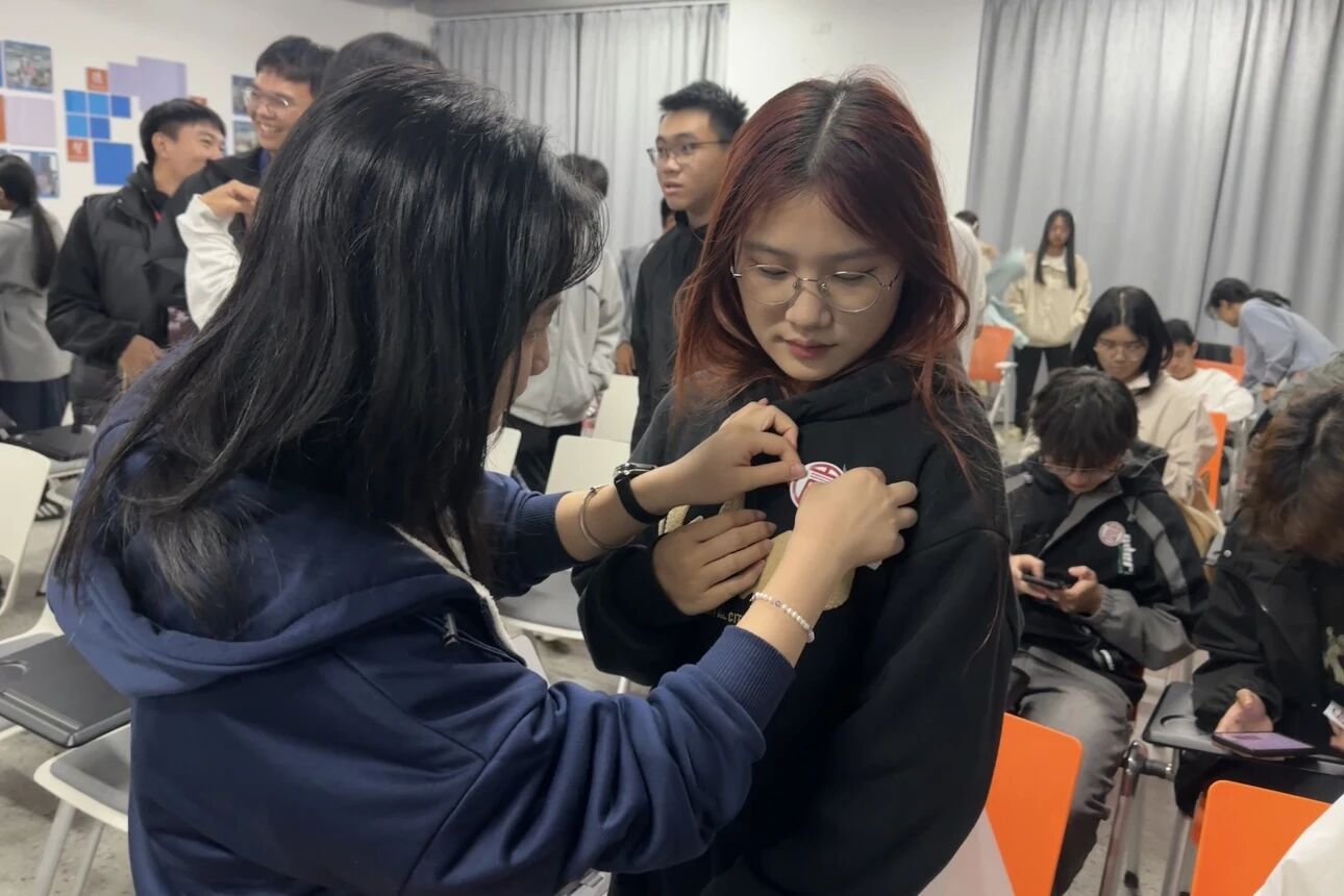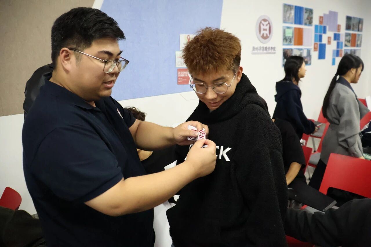 仪式的重要环节——颁发书院徽章随之展开。陈浩华、张蒙莉等书院导师、各辅导员及助班代表依次为新生佩戴书院徽章。最后,全体出席人员在书院门前合影留念。镜头定格下一张张青春洋溢的脸庞,也为本次新生入院仪式画上了圆满的句号。