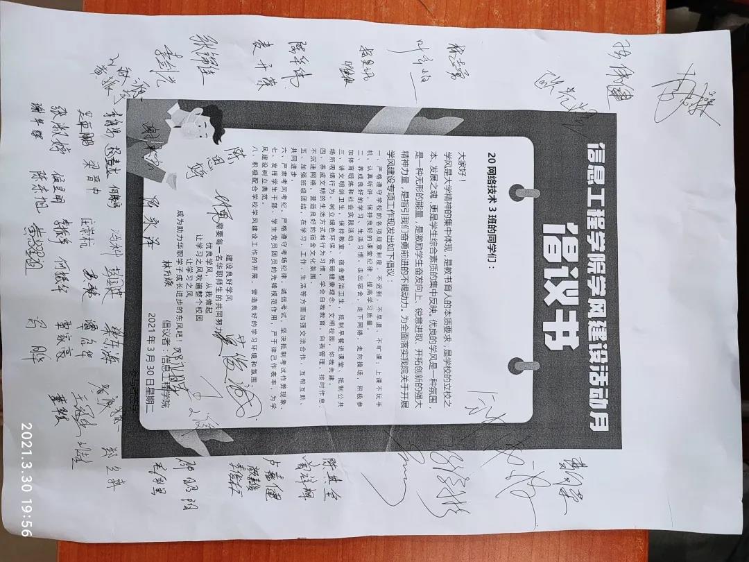 李影老师,带来了学风建设活动月的倡议书给20网络技术3班的同学集体签名,提醒我们在新的学期里要更奋发向上,锐意进取。