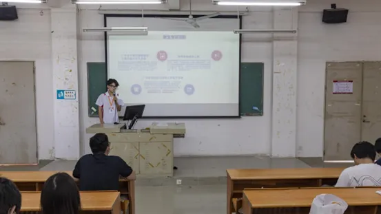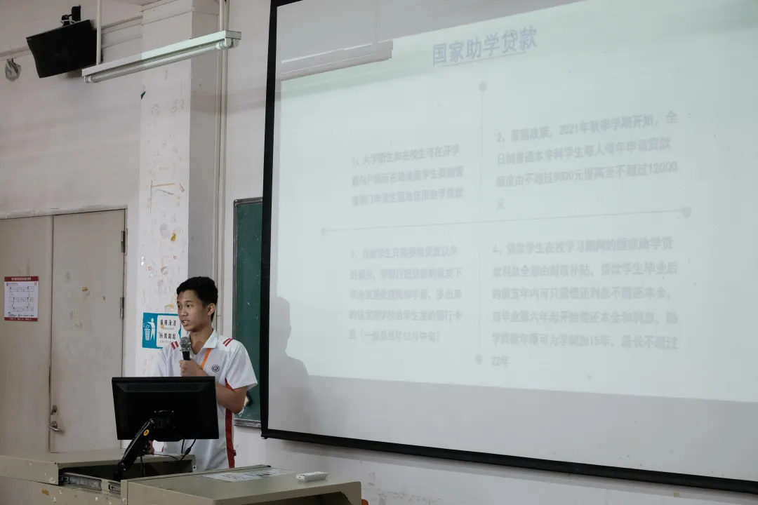 优秀学生干部、优秀毕业生陈奕民为大家讲解三项新生专项资助,包括广东省家庭经济困难大学新生资助、广东省少数民族聚居区少数民族大学生资助和南粤扶残助学工程。接着,他为大家讲解了勤工俭学是由学校组织,让大学生利用课余时间通过劳动合法取得报酬,改善生活条件的实践活动,时间限制每周不超过8小时,通过贫困认定的学生优先考虑,在勤工俭学期间若学生违反校规,情节严重者可取消勤工俭学资格。