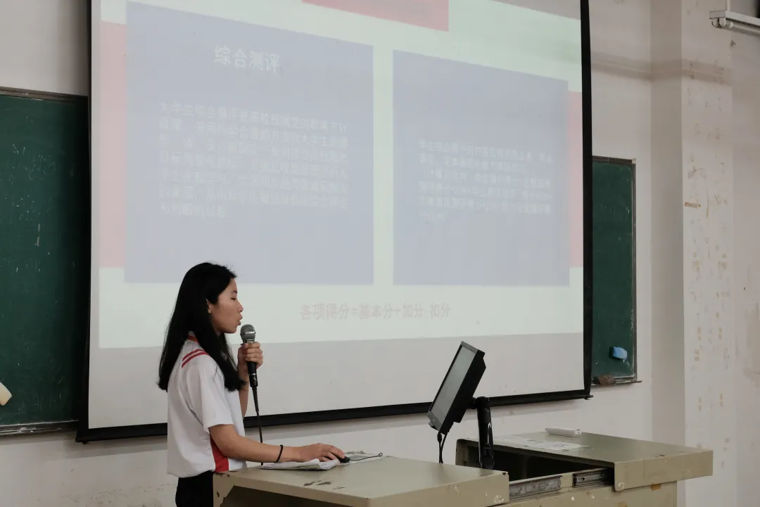 紧接着,他为大家说明了优秀学生干部的要求不仅要学业优异,思想、道德品质也是重要考核内容,要敢为人先,优秀学生干部获得者由学校颁发荣誉证书,并予以表彰。